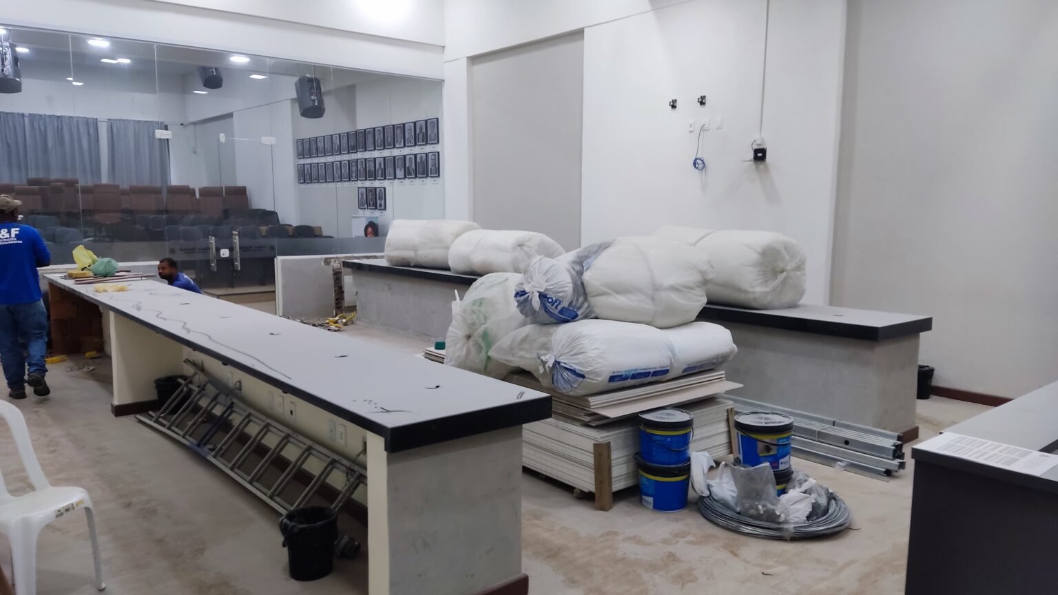A Câmara Municipal de Feira de Santana iniciou, na última quinta-feira (03), mais uma importante etapa de requalificação de suas instalações. Por determinação do presidente da Casa, vereador Marcos Lima (União Brasil), foi autorizada a obra de rebaixamento do forro do teto e aplicação de revestimento acústico no plenário.
