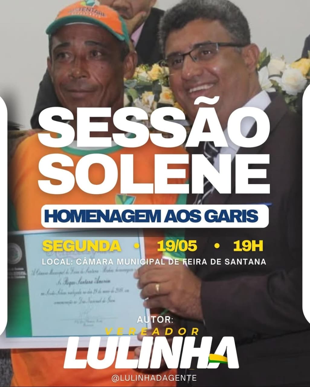 O vereador Luiz Augusto de Jesus (União Brasil) tem a honra de convidar toda a sociedade para a sessão solene em homenagem ao Dia do Gari, que ocorrerá na próxima segunda-feira, 19 de maio, às 19h, na Câmara de Vereadores de Feira de Santana.