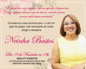Acontecerá no período da noite às 19:00h, um culto de ação de graça pela passagem do aniversario da vereadora, que acontecerá no espaço Reality Eventos, situado no prolongamento da Avenida Fraga Maia depois do conjunto João Paulo ll.