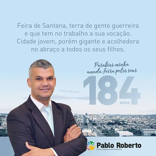 Secretario Pablo Roberto parabeniza Feira de Santana pelos 184 anos