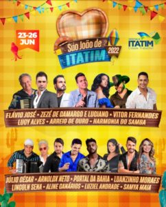 Após 2 anos sem poder curtir o maravilhoso “arrasta-pé”, em 2022 a alegria acontece novamente em Itatim. A festa terá como tema “De volta a tradição que aquece o nosso coração”. A Prefeitura de Itatim já divulgou as principais atrações que irão se apresentar na cidade entre os dias 23 e 26 de junho, na Praça de Eventos.