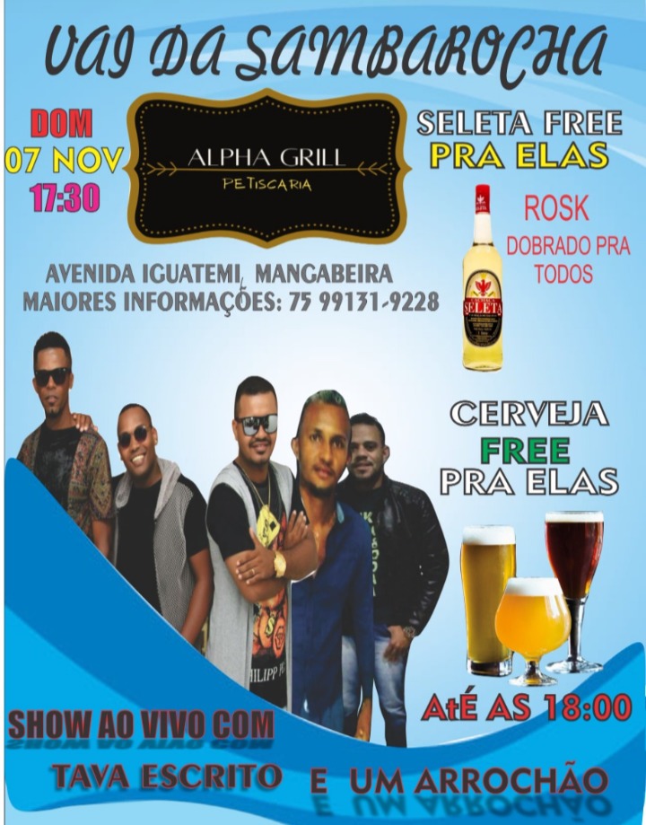 Já no Domingo (07), quem pisa no palco mágico do Alpha Grill, é a banda Tava Escrito, neste ritmo Vai dá Samba, para melhorar a festa, Kleiton garante a alegria na mulherada, cerveja free até às 18hs observação (válido a partir das 17:30h). Nesta pegada de promoção, ainda tem cachaça coleta (free) e Caipirosca dobrada para todos.