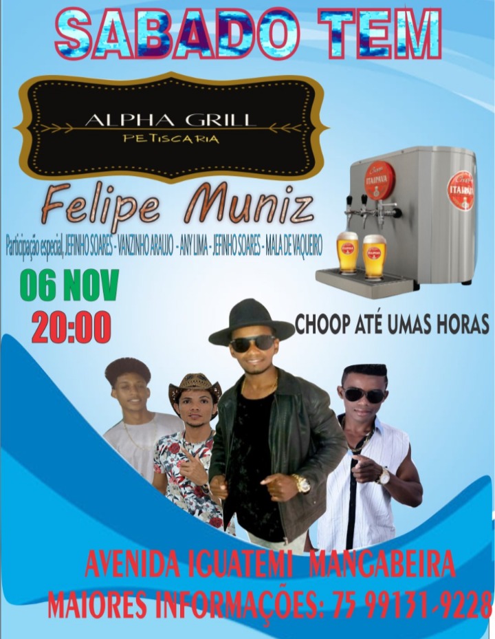 Neste sábado (06) às 20 hs Felipe Muniz anima o público. No palco do Alpha Grill Felipe Muniz traz participações especiais de Jefinho Soares, Vanzinho Araújo, Any Lima e Mala de Vaqueiro.