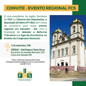 O evento será aberto às pessoas envolvidas com o setor de comércio e serviço, proprietários, gerentes e fornecedores de empresas do setor, que tenham envolvimento com as entidades empresariais de livre adesão no âmbito do estado e do município, e terá, como convidados o Senador Efraim Filho, Presidente da FCS, no Senado; Dep. Domingos Sávio, Presidente, na Câmara, da FCS; Manoel Vitório, Secretário de Fazenda do Estado da Bahia; representantes da Federação do Comércio de Bens, Serviços e Turismo do Estado da Bahia (FECOMÉRCIO), Dr. Bruno Branco e Dr. Sérgio Couto; representantes do Instituto dos Auditores Fiscais do Estado da Bahia, Presidente Marcos Carneiro, e o Diretor de Assuntos Fiscais e Tributários, Tolstoi Nolasco; e a Presidente da Junta Comercial do Estado da Bahia – Dra. Marise Prado de Oliveira Chastinet; a Deputada Federal Alice Portugal e o Deputado Federal Pastor Gil, dentre outros convidados.