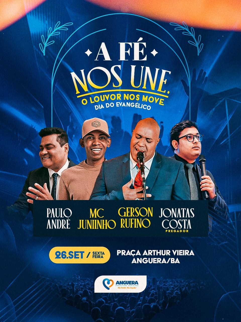A Prefeitura Municipal de Anguera promoverá, no dia 26 de setembro, uma grande celebração em homenagem ao Dia do Evangélico, com o tema “A fé nos une. O louvor nos move.” O evento será realizado na Praça Arthur Vieira e contará com apresentações musicais e momentos de adoração que prometem marcar a história da cidade.