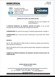 O Prefeito Mauro Vieira através do Decreto de número 30 do dia 01 de Junho, realiza a mudança da data da Feira Livre. Considerando que na sexta-feira 24 é comemorado o dia oficial do São João, a Feira foi antecipada para quinta-feira 23.