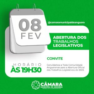 O presidente da Câmara Municipal de Anguera, vereador Felipe Vieira PL, convida a população para participar da abertura dos trabalhos legislativos de 2023. A Sessão Ordinária acontece no dia 08 às 19:39h.
