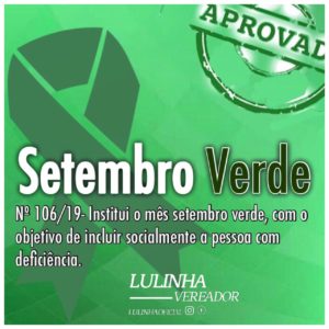 Com o intuito de proporcionar visibilidade a inclusão social da pessoa com deficiência no município, o vereador Luiz Augusto de Jesus – Lulinha (DEM) apresentou na Câmara Municipal, o Projeto de Lei nº 106/19, instituindo a campanha “Setembro Verde” em defesa dos direitos da pessoa com deficiência, inspirada pelo dia 21 de setembro, que comemora-se o Dia Nacional de Luta das Pessoas com Deficiência. A proposta foi aprovada por unanimidade, na sessão ordinária desta terça-feira (24), em segunda e última votação.