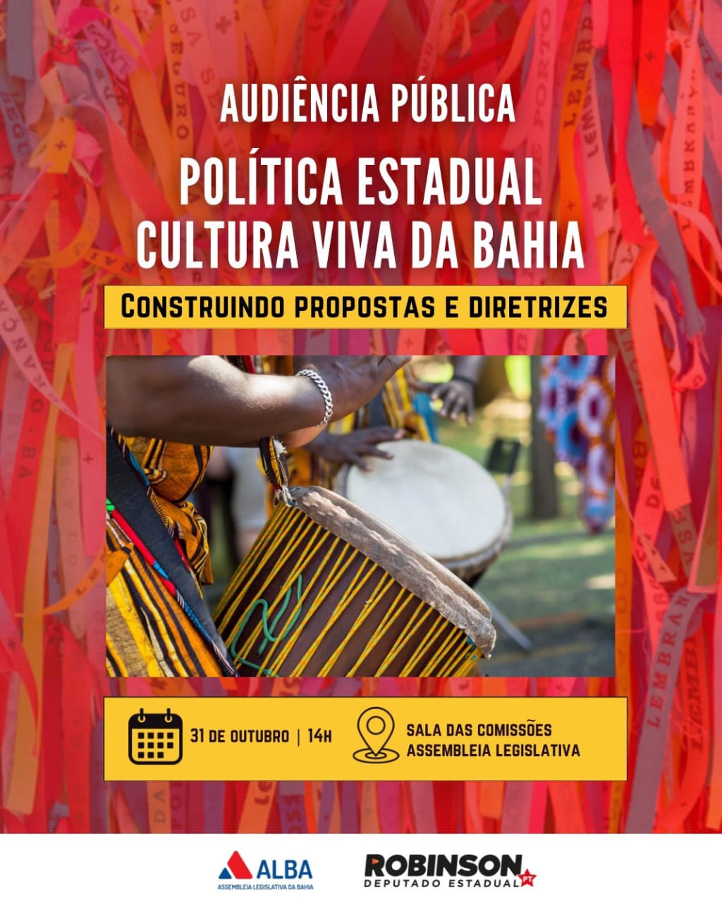 A Assembleia Legislativa sedia, na quinta-feira (31), às 14 horas, uma audiência pública, proposta pelo deputado Robinson Almeida (PT), para debater a Política Estadual de Cultura Viva da Bahia. O evento ocorrerá na Sala das Comissões e é aberto ao público interessado no tema.