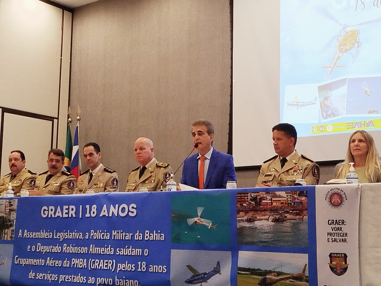 Os 18 anos de atuação do Grupamento Aéreo da Polícia Militar da Bahia (Graer), responsável por reforçar operações de segurança pública, apoiar ações de saúde e resgates de urgência no estado, foram celebrados, nesta segunda-feira (11), pela Assembleia Legislativa em Solenidade Comemorativa proposta pelo deputado estadual Robinson Almeida (PT). O evento aconteceu no Auditório Jorge Calmon e teve a presença do Comandante-Geral da Polícia Militar da Bahia, Coronel Paulo Coutinho, do Comandante do Graer, Tenente Coronel Carlos Victor Taranto Lima Braga Filho, e de trabalhadores da força de segurança do estado.
