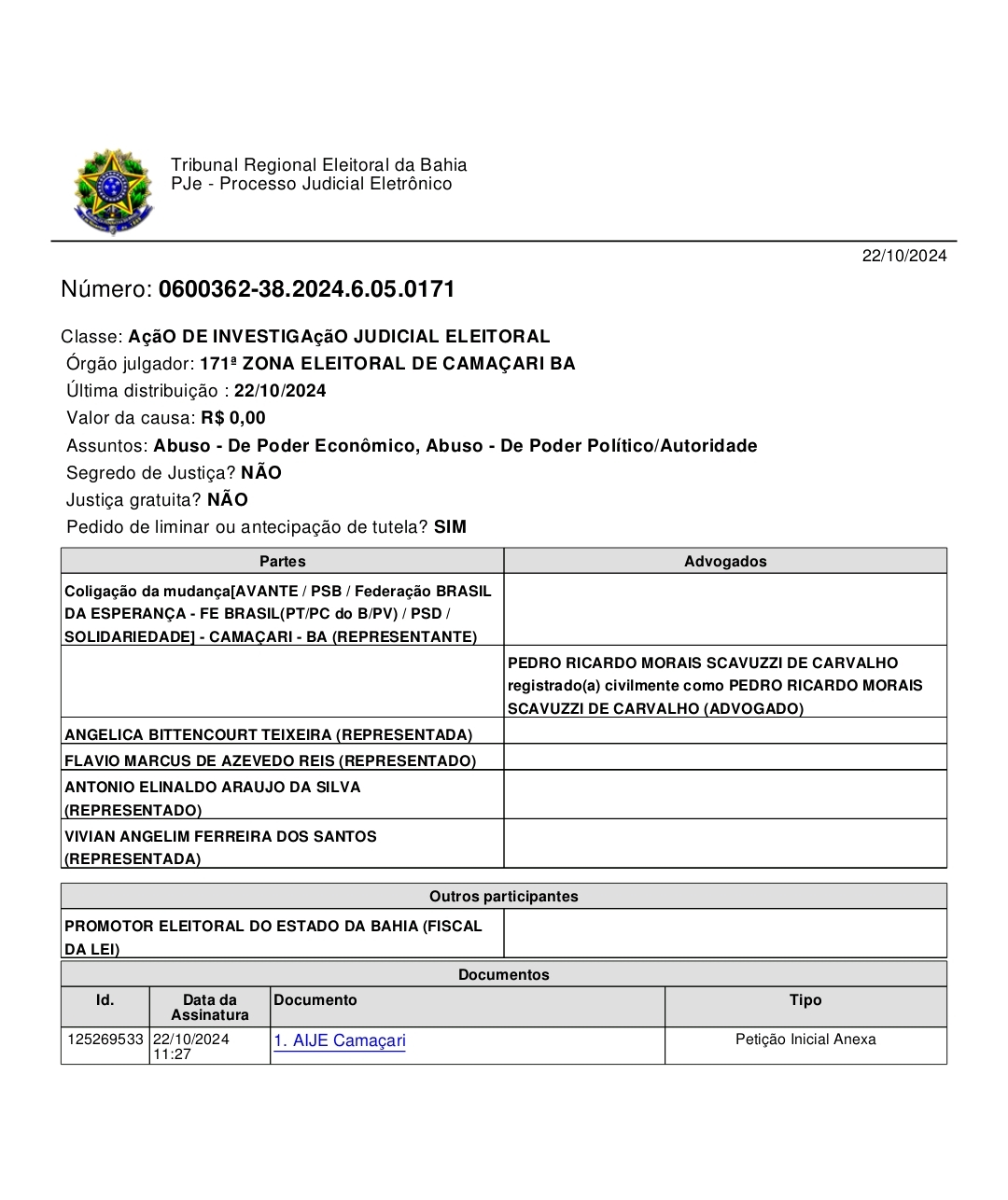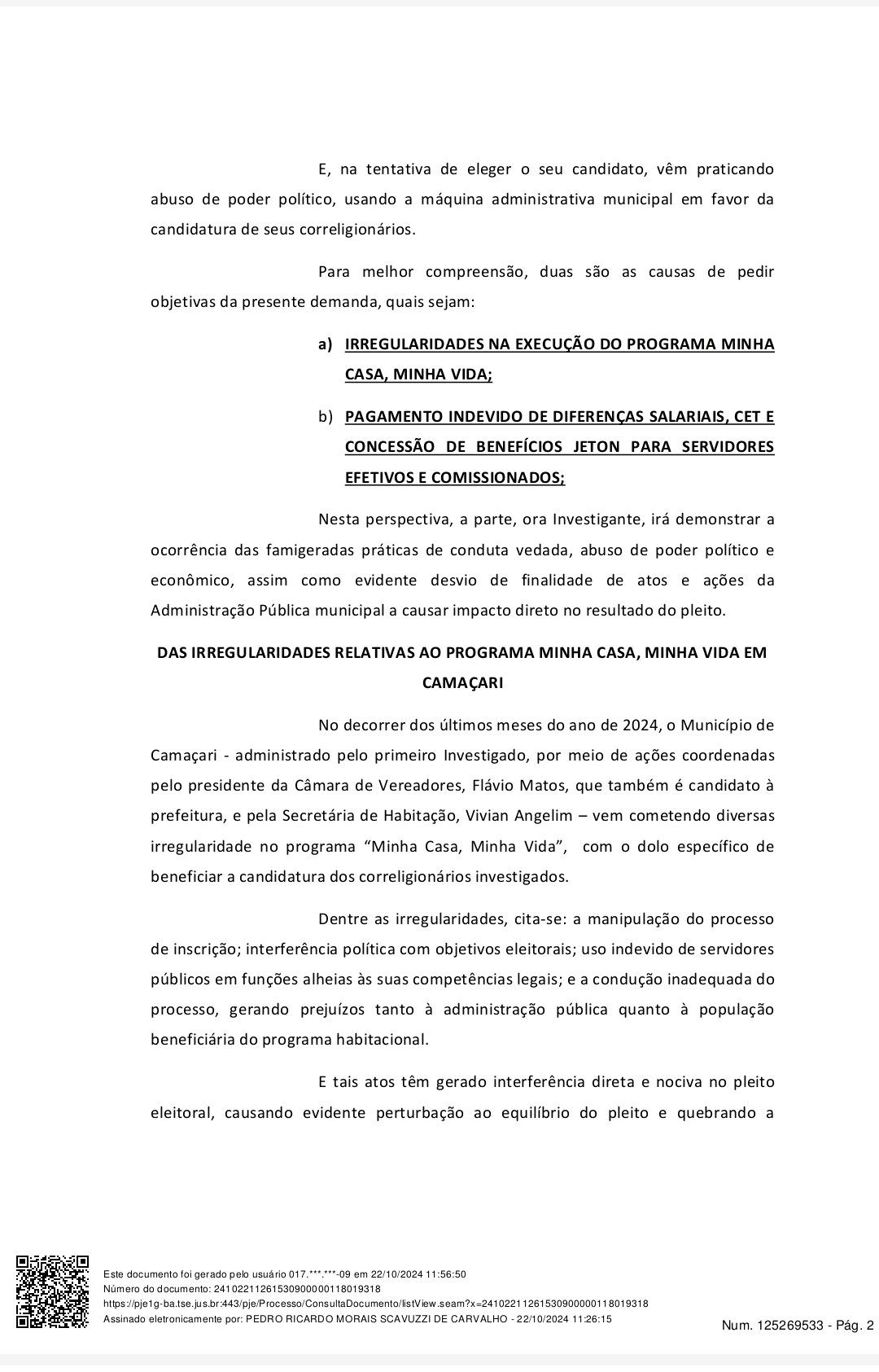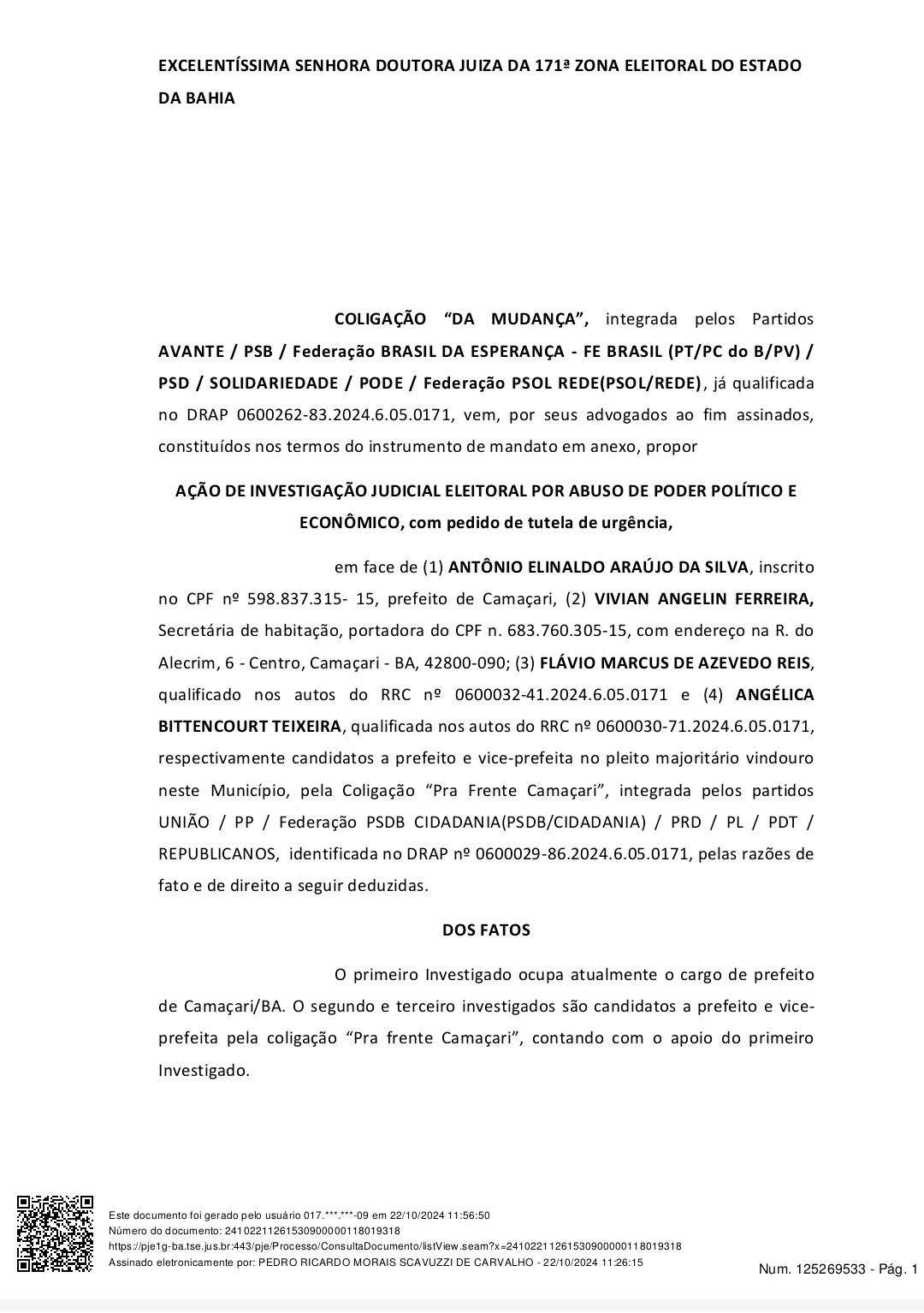 A Coligação da Mudança, liderada por Luiz Caetano (PT), entrou com uma Ação de Investigação Judicial Eleitoral (AIJE) na 171ª Zona Eleitoral de Camaçari, acusando o prefeito Elinaldo Araújo e membros de sua administração de abusarem da máquina pública para favorecer a candidatura de Flávio Matos (União Brasil) e Angélica Teixeira. A ação denuncia o uso indevido do programa federal “Minha Casa, Minha Vida” e o pagamento de gratificações irregulares a servidores públicos com o objetivo de garantir apoio político.
