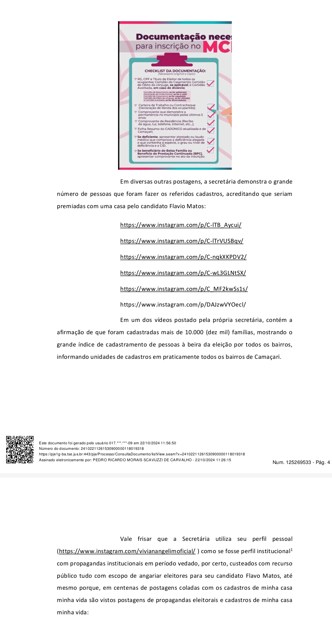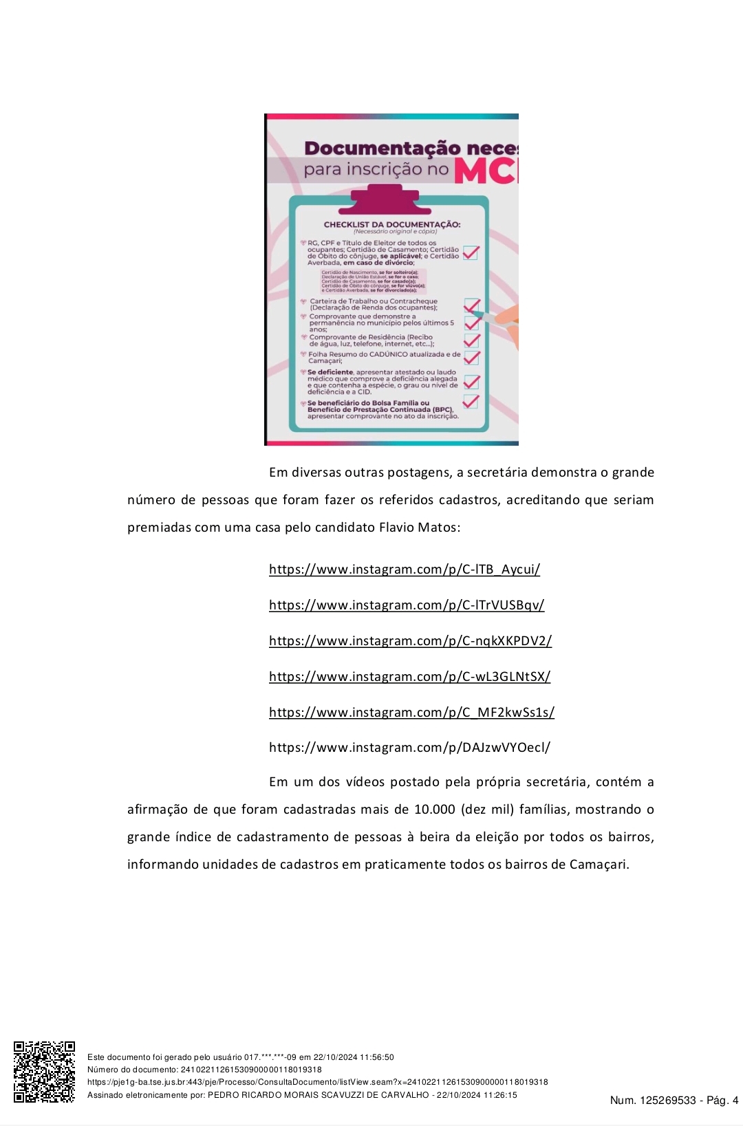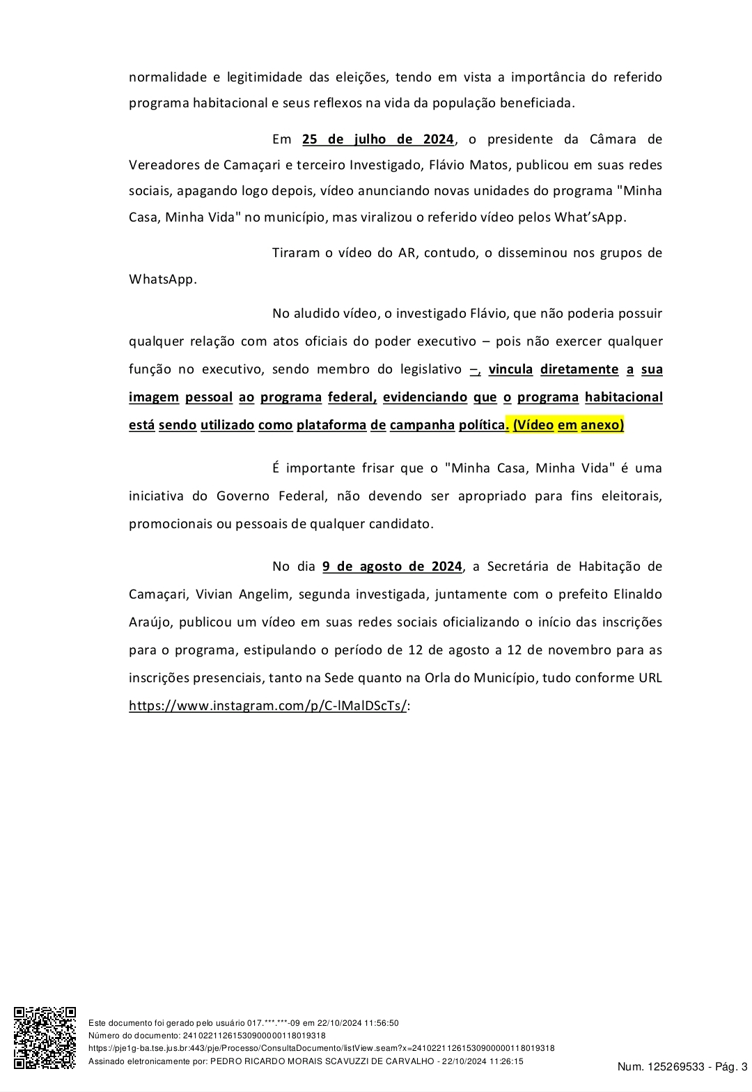 Segundo a denúncia, a prefeitura de Camaçari manipulou o programa habitacional durante o período eleitoral, vinculando a concessão de moradias ao sucesso eleitoral de Flávio Matos. Vídeos divulgados nas redes sociais, posteriormente apagados, mostram a secretária de Habitação, Vivian Angelim, e o próprio Matos utilizando o programa para promover sua candidatura. O material circulou amplamente em aplicativos de mensagens, sugerindo que a obtenção de moradia dependia do voto no candidato apoiado por Elinaldo.