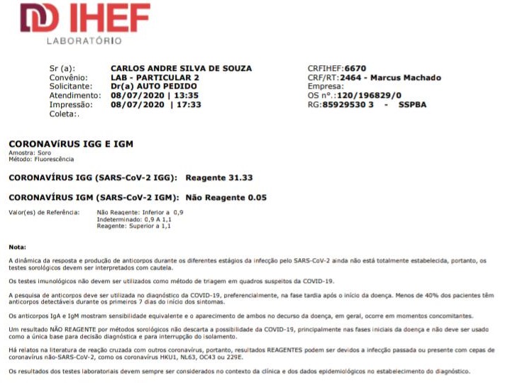 “Olá pessoal!! Todos sabem que contrair o coronavírus COVID-19. Mesmo tomando todos os cuidados necessários de prevenção, ainda assim fui infectado. E ao saber que estava com o vírus, cumprir corretamente as recomendações dos órgãos responsáveis para o cumprimento do período de isolamento domiciliar. Confesso que depois do resultado positivo para o covid 19, fiquei um pouco aflito e ansioso. Tive alguns sintomas, (Dor no corpo, perda de apetite, paladar e olfato ) mas graças a Deus sem febre ou graves complicações, seguir cumprindo o isolamento domiciliar. E no dia 08/07 (quarta-feira) pela manhã fui fazer o teste novamente, e na tarde deste mesmo dia o resultado saiu e graças ao meu bom e maravilhoso Deus, estou curado, agradecido e muito contente. Sigo agora me cuidando e fazendo a minha parte para o bem de todos, agradeço a tantos quantos fizeram orações por mim, que me mandaram uma mensagem de apoio e carinho, sou grato por cada um de vocês”, informou Del.