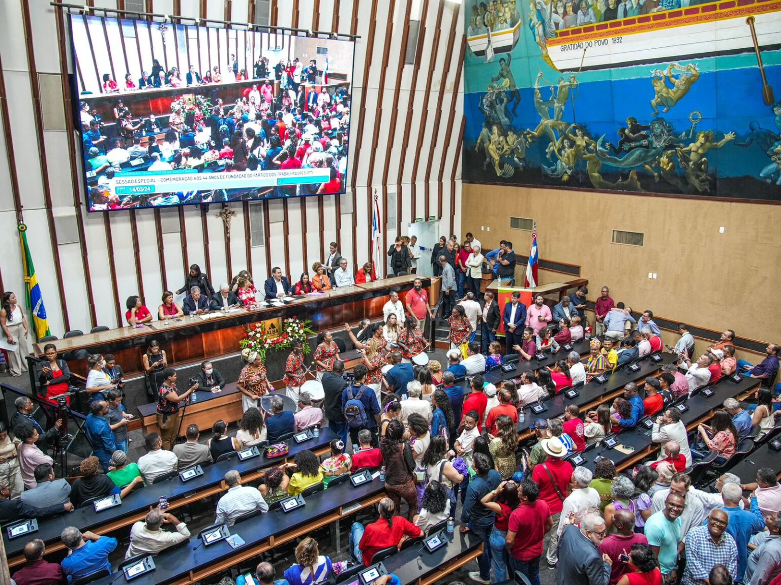 O Partido dos Trabalhadores da Bahia promoveu nesta quinta-feira, 14, a celebração dos 44 anos da legenda. Realizada na Alba, a sessão especial contou com a presença de dirigentes, como o presidente Éden Valadares, do senador da república, Jaques Wagner, de parlamentares, prefeitos, secretários de Estado e movimentos sociais. Na ocasião, o partido reafirmou a continuidade da luta pela democracia e a defesa dos direitos da classe trabalhadora e da população como algumas das suas principais bandeiras e dedicou a celebração à militância, considerada como o maior patrimônio do PT.