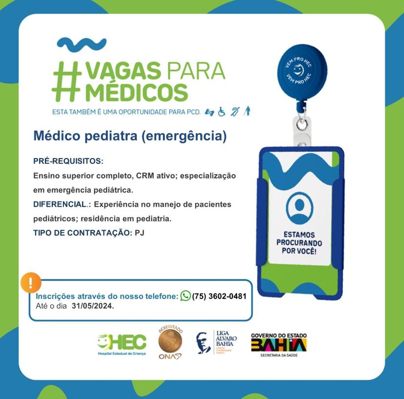 O Hospital Estadual da Criança, em Feira de Santana, está contratando médicos especialistas em ortopedia, pediatria e anestesiologia. A chegada de novos profissionais, que serão contratados em regime de pessoa jurídica (PJ), visa ampliar o atendimento da unidade para acolher o aumento da demanda, que deve-se, em parte, à sazonalidade do período e à baixa resolutividade das unidades municipais.