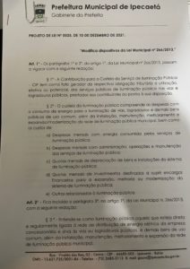 Está em movimentação na Câmara Municipal e com grande chance de passar (dado a adesão de simpatizantes) o projeto de Lei 0025/2021 que tentou criar a CIP- Contribuição de Iluminação Pública na cidade.