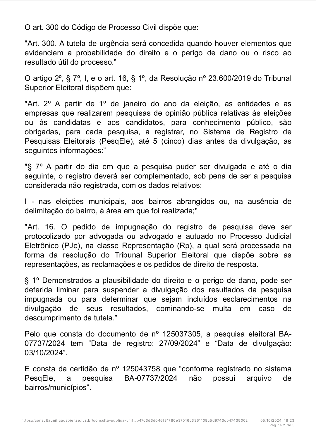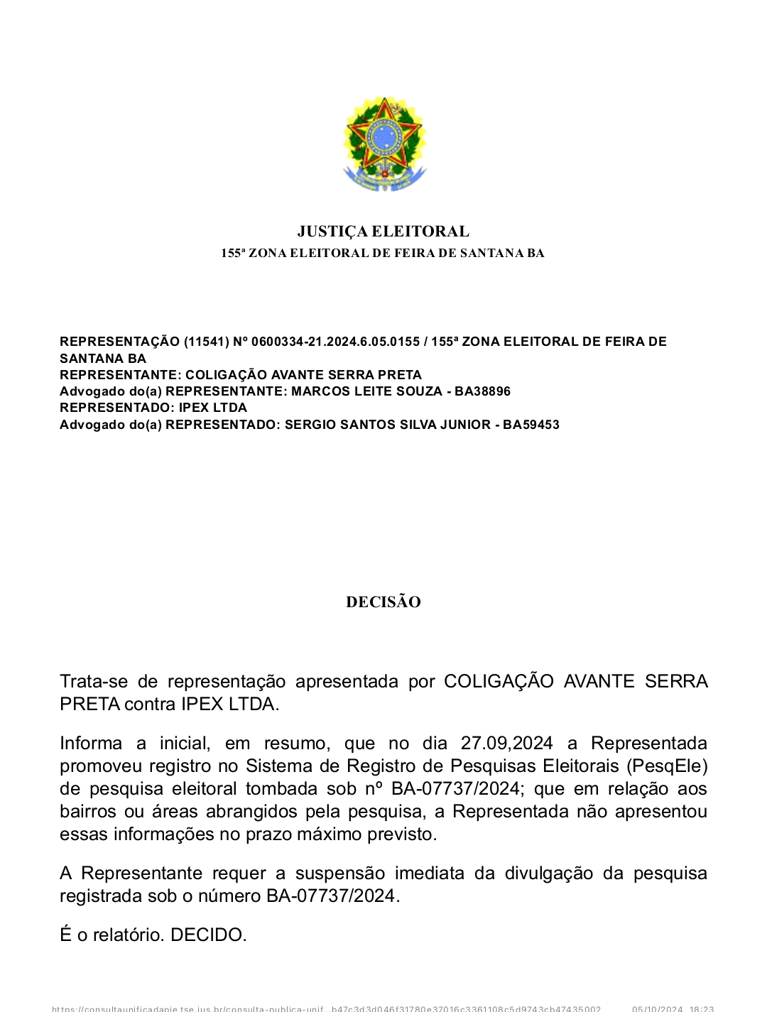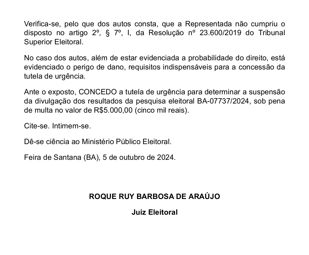 Em resposta à irregularidade, a Justiça determinou que a divulgação da pesquisa está proibida, sob pena de multa de R$ 5.000,00 para qualquer veículo ou pessoa que compartilhe os resultados do levantamento suspenso.