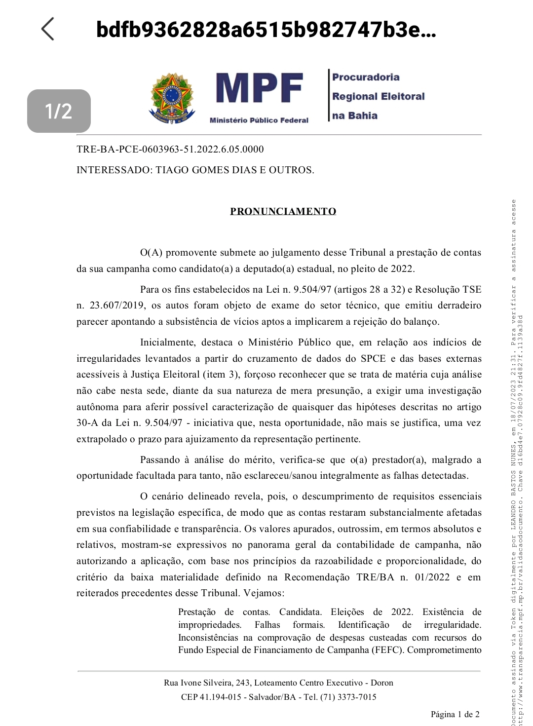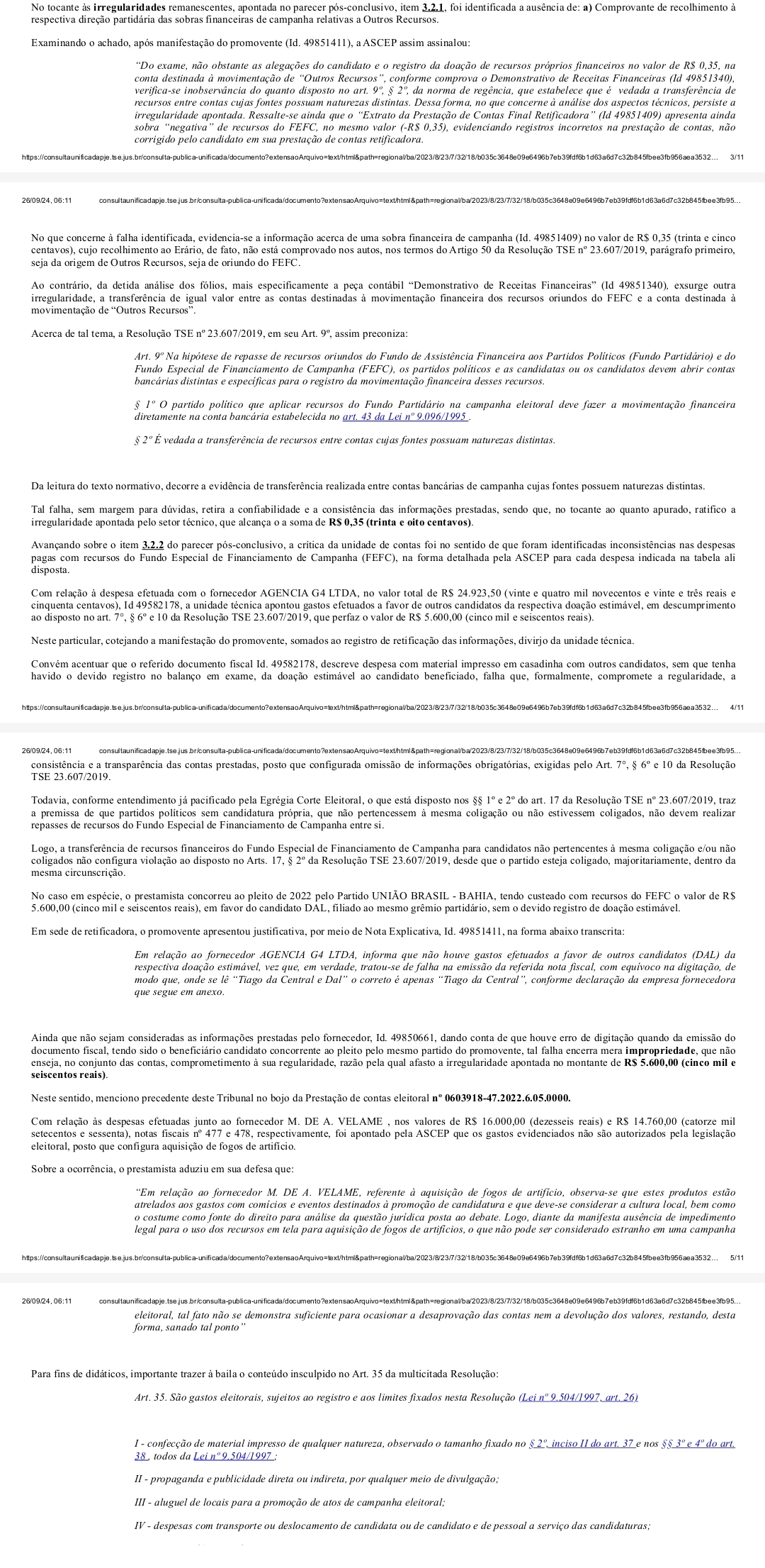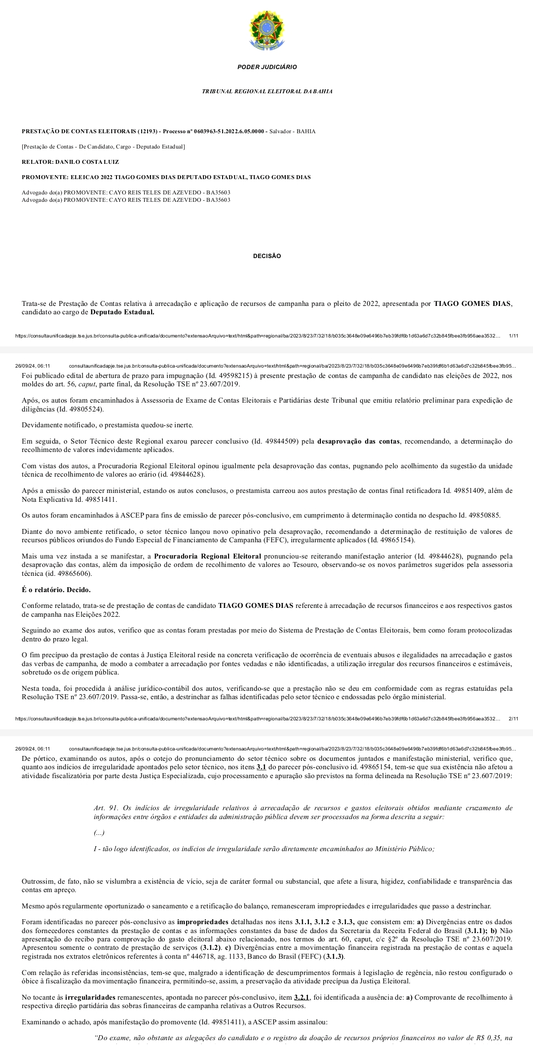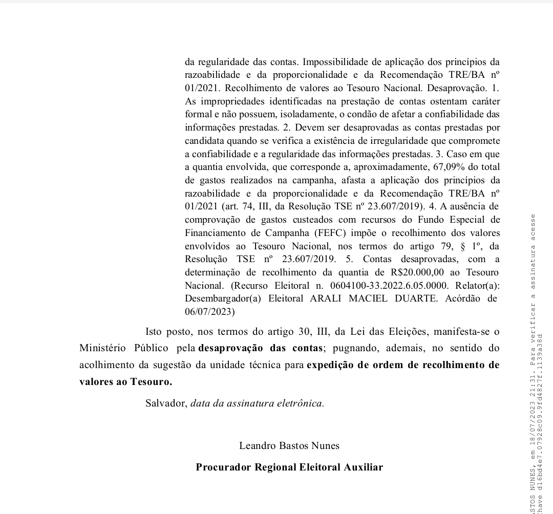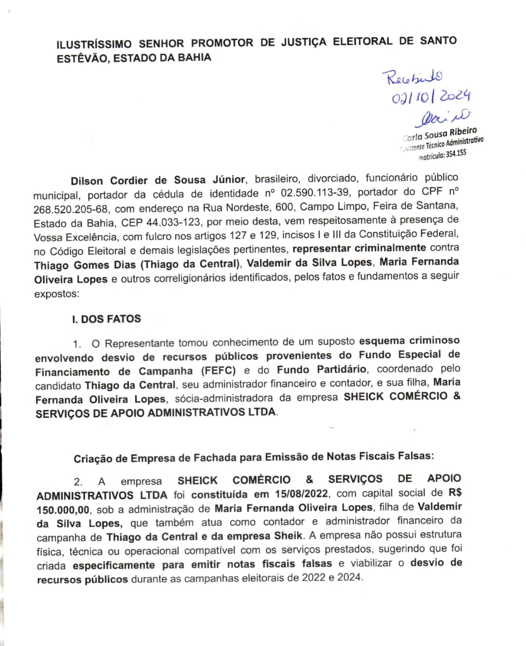 O Ministério Público Eleitoral de Santo Estêvão deve investigar uma denúncia que aponta um suposto esquema de desvio de recursos públicos envolvendo o candidato Thiago Central (União Brasil), e outros envolvidos, incluindo Valdemir da Silva Lopes e Maria Fernanda Oliveira Lopes. A denúncia sugere irregularidades na utilização do Fundo Especial de Financiamento de Campanha (FEFC) e do Fundo Partidário.