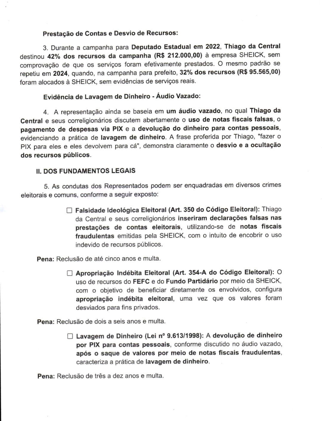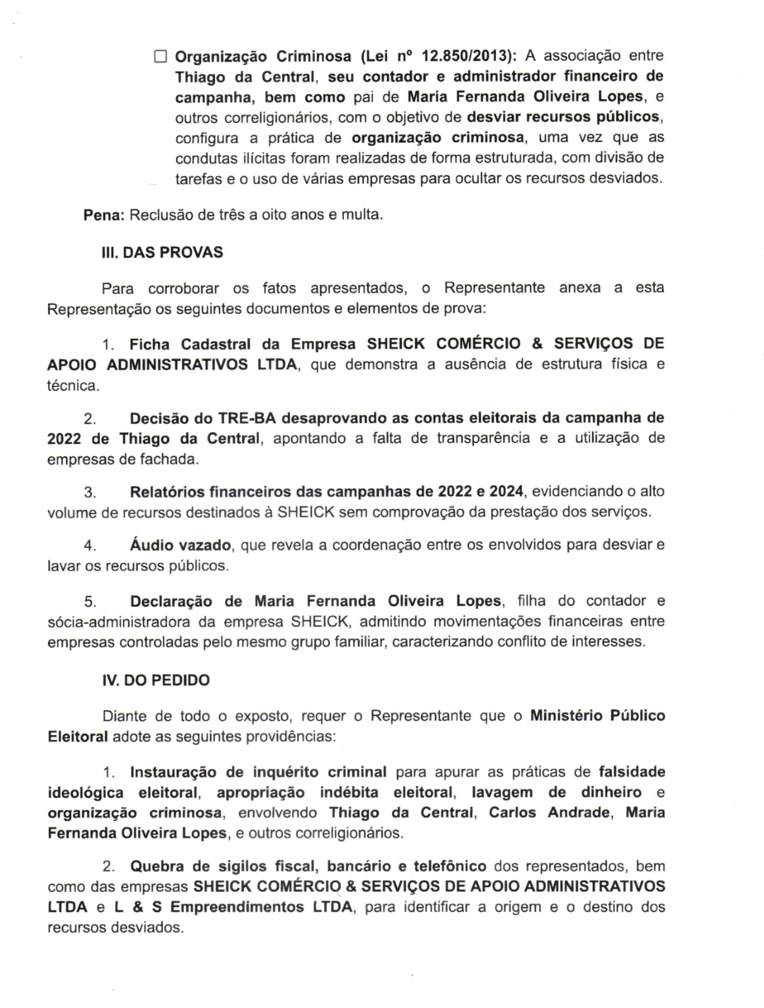 Agora, em 2024, a denúncia aponta que Thiago da Central já destinou 32% dos recursos de sua campanha atual (R$ 95.565,00) à mesma empresa, sem que haja comprovação de serviços prestados. Valdemir da Silva Lopes, além de pai de Maria Fernanda, também atua como contador e administrador financeiro da campanha, levantando suspeitas sobre a repetição do suposto esquema de corrupção.