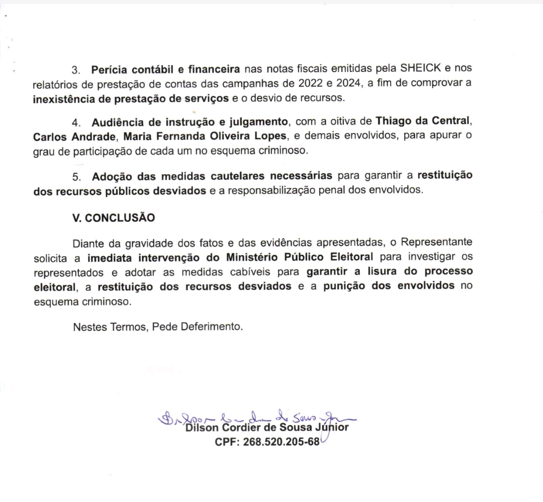 A denúncia solicita que o Ministério Público Eleitoral inicie uma investigação imediata, requerendo a devolução dos valores supostamente desviados e a punição dos envolvidos. O caso será investigado pelo MP Eleitoral, que poderá aprofundar as apurações para verificar a real participação dos denunciados no suposto esquema. Caso as irregularidades sejam confirmadas, as consequências poderão incluir o bloqueio de recursos, a reprovação das contas de campanha e possíveis sanções penais aos envolvidos.
