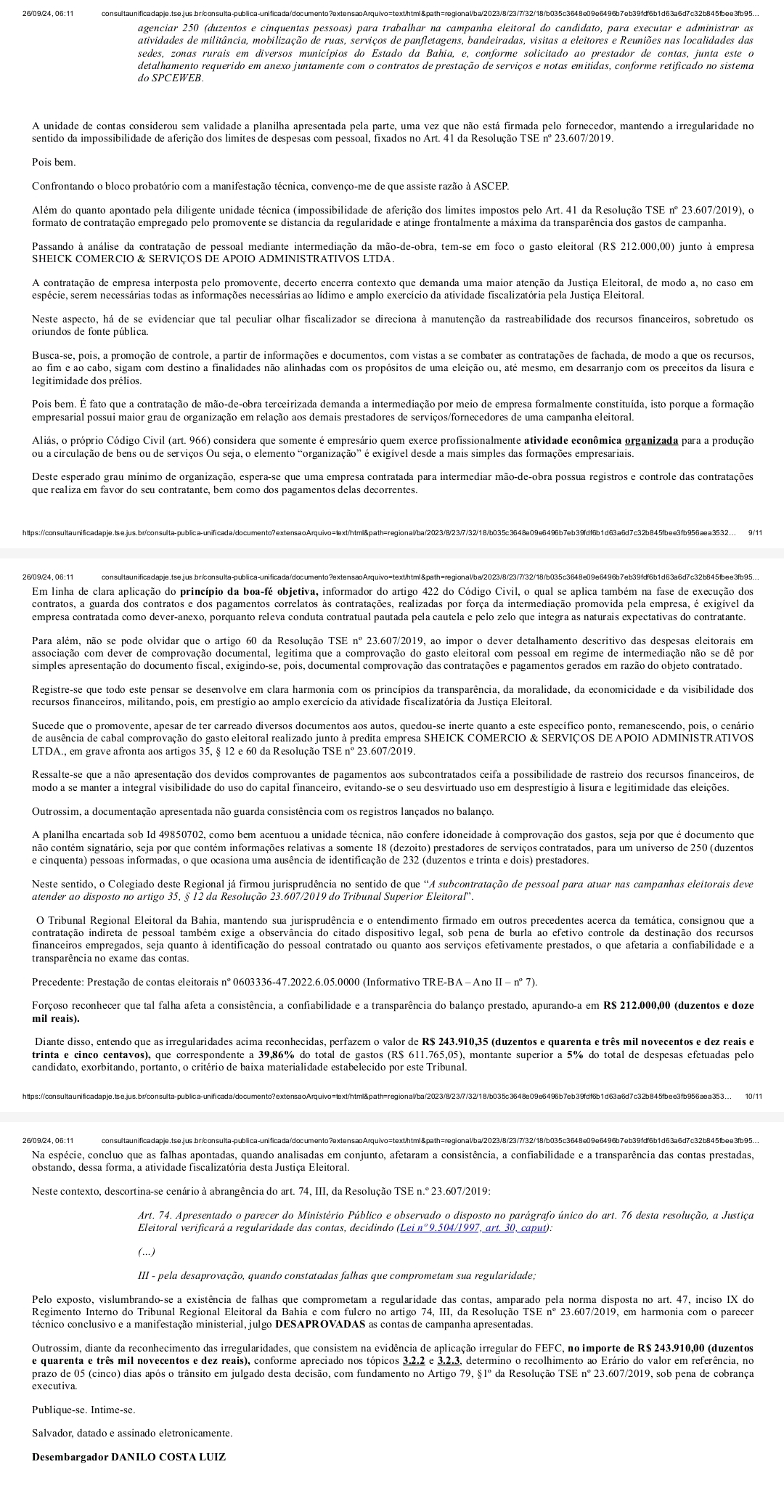 Em 2022, o Tribunal Regional Eleitoral da Bahia (TRE-BA) desaprovou as contas de campanha de Thiago, com base em parecer do procurador regional eleitoral auxiliar, Leandro Bastos Nunes, que destacou falhas graves na contratação de serviços pela Shieck. Dos R$ 212 mil destinados à empresa na época, não houve comprovação da totalidade dos prestadores de serviços contratados. Apenas 18 dos 250 profissionais informados pela campanha foram identificados. Além disso, o TRE determinou o ressarcimento de R$ 243.910,00 ao Erário, valor considerado aplicado irregularmente.