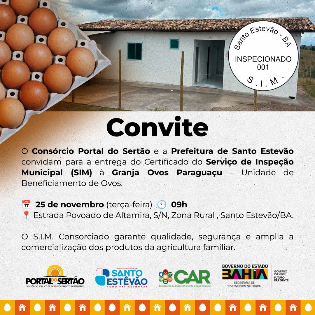 A Prefeitura Municipal de Santo Estêvão, por meio da Secretaria de Agricultura, Pecuária, Desenvolvimento Econômico e Rural (SEADER), celebra um marco para o município: a Granja Ovos Paraguaçu é a primeira unidade de produtos de origem animal a receber o Certificado do Serviço de Inspeção Municipal (SIM), no âmbito do Consórcio Portal do Sertão.