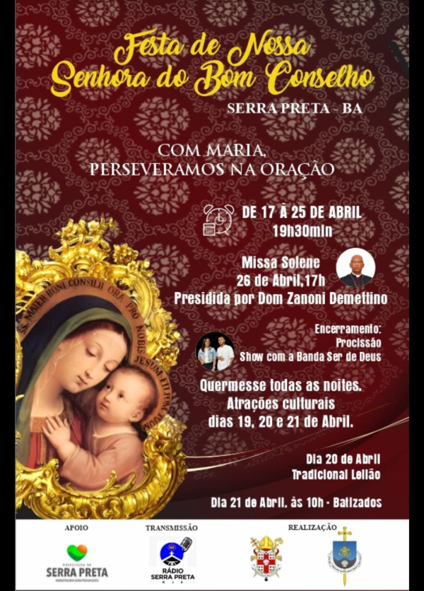 A população de Serra Preta está se preparando para participar da tradicional festa em honra a Nossa Senhora do Bom Conselho, padroeira da cidade. O evento, que marca o calendário religioso local, terá início no dia 17 e está programado para encerrar no dia 26 de abril deste ano.