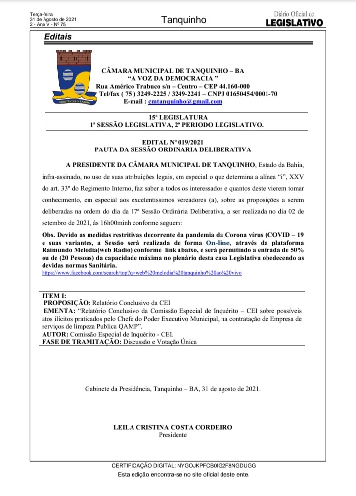 A Câmara Municipal de Tanquinho/Bahia vota nesta quinta-feira (02), o relatório final das apurações da CEI-Comissão Parlamentar de Inquérito, que apura irregularidade da Prefeitura na contratação da empresa responsável pela limpeza pública QAMP.