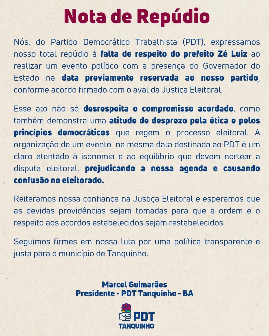 O partido PDT municipal emitiu carta repúdio contra o ato do prefeito Zé Luiz que impediu a realização de evento de sua campanha.