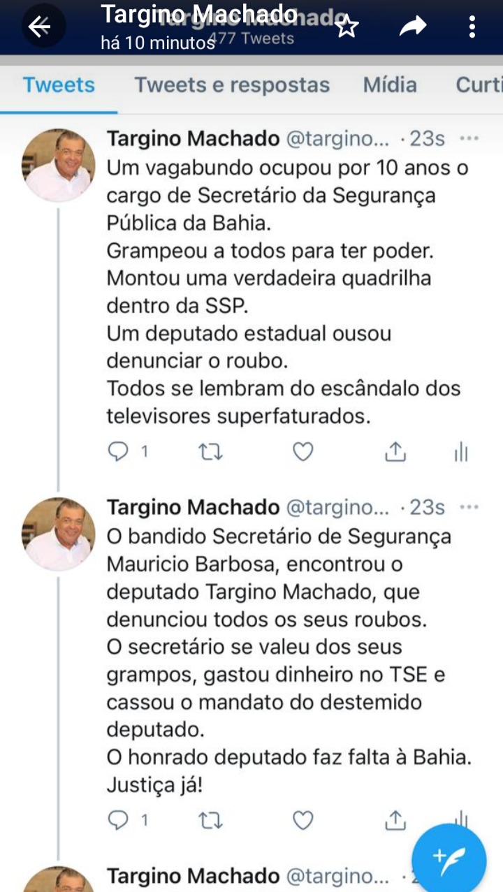 “O bandido do secretário Maurício Barbosa, encontrou o deputado Targino Machado que denunciou toda seus roubos. O secretário gastou dinheiro no TSE e cassou o mandato do destemido deputado “, postou Targino. O honrado deputado faz falta a Bahia, “justiça já!!” pede Targino.