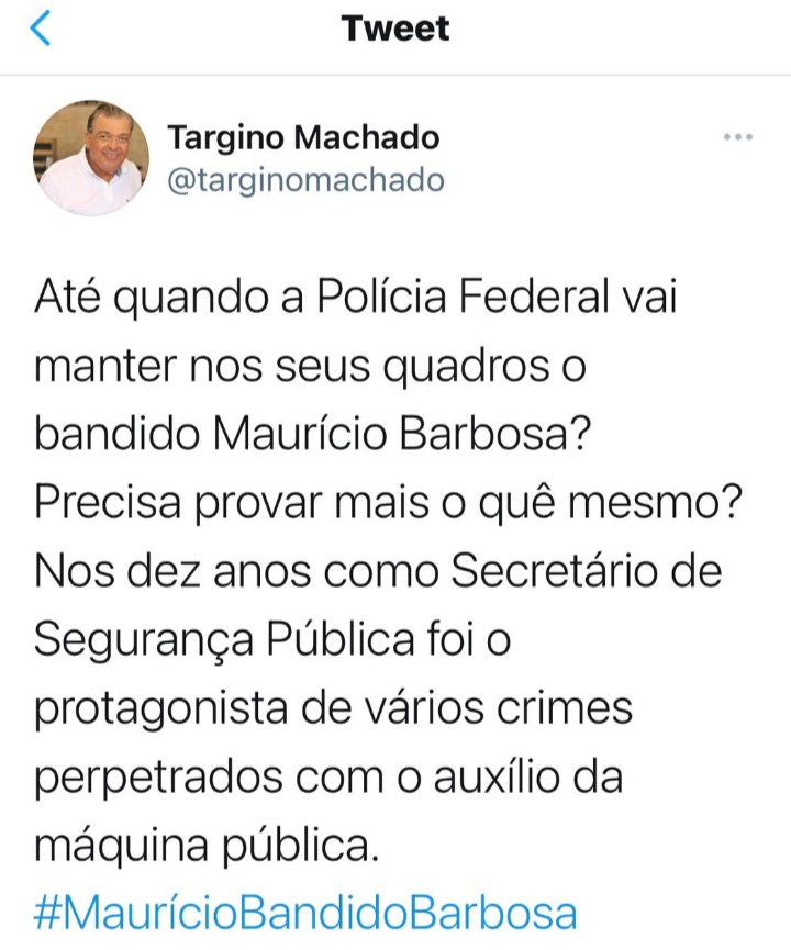 “Até quando a Polícia Federal vai manter nos seus quadros o bandido Mauricio Barbosa? Precisa provar mais o quê? Nos dez anos como secretário de segurança pública foi o protagonista de vários crimes perpetrados com o auxílio da máquina pública”, cravou Targino em sua rede social Tweet.
