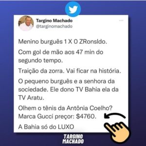 Em postagens no Twitter, Targino diz que ACM Neto teria se vingado de Zé Ronaldo, por ele ter declarado apoio a Bolsonaro em 2018, “Neto não perdoa!”.