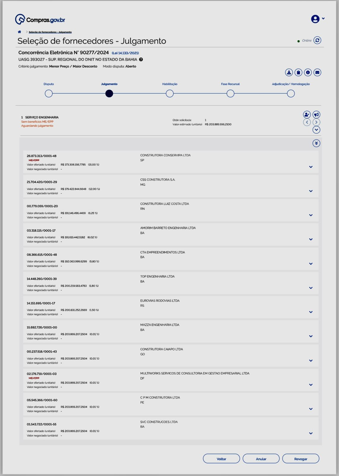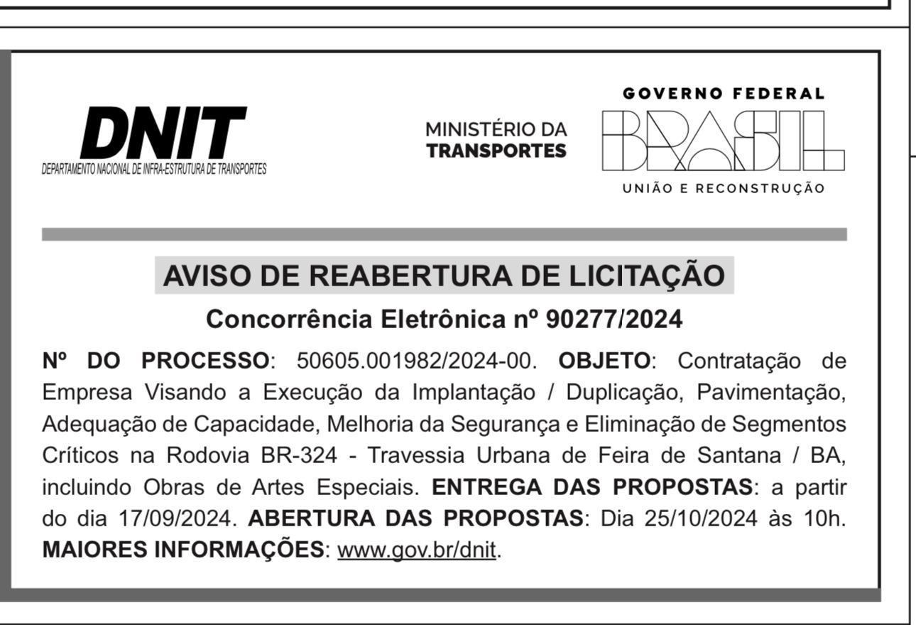 Na última sexta (25), foi realizada no Departamento Nacional de Infraestrutura de Transportes (DNIT), em Brasília, a abertura dos envelopes da licitação para a realização das obras de duplicação do Anel de Contorno, parte que liga a BR-324 até o bairro Cidade Nova, em Feira de Santana. A informação foi dada pelo deputado federal (licenciado) Zé Neto, que também esclareceu que 12 empresas apresentaram suas propostas.