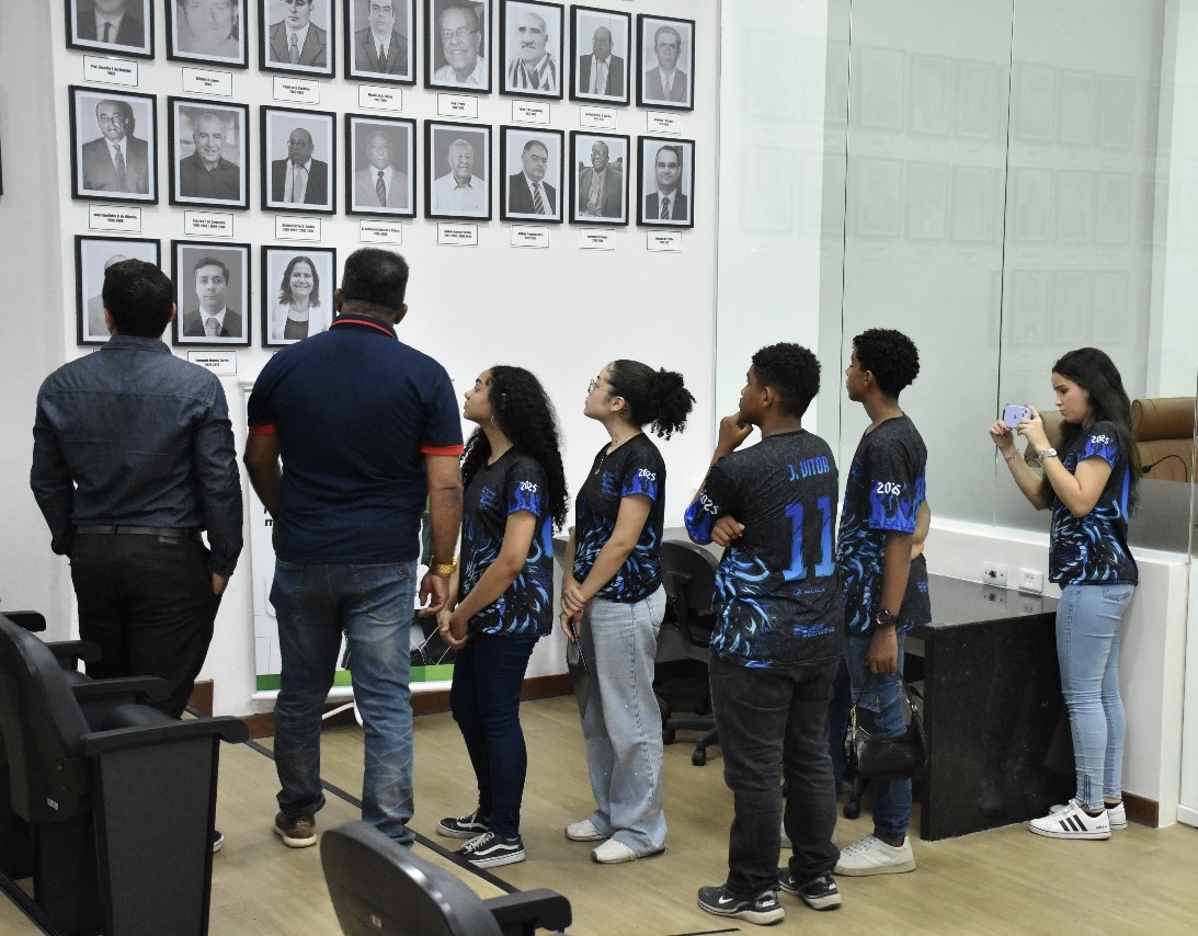 A equipe de cinco estudantes – João Vitor, Anna Liz, Isabelle Gonçalves, Ana Beatriz e Joney Cruz – realizou um tour pelas dependências da Câmara, conhecendo cada setor e aprendendo sobre os processos que regem o trabalho dos vereadores. Durante a visita, os alunos demonstraram grande interesse, fazendo perguntas sobre o funcionamento de cada departamento e sobre a importância das leis para a sociedade.
