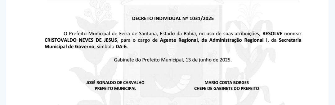 Após meses de espera, polêmicas públicas e até declarações de que chegou a passar fome, o ativista político Cristovaldo Neves de Jesus finalmente foi nomeado para um cargo na Prefeitura de Feira de Santana. O ato de nomeação foi publicado no Diário Oficial deste sábado (14), por meio do Decreto Individual nº 1031/2025, assinado pelo prefeito José Ronaldo de Carvalho.