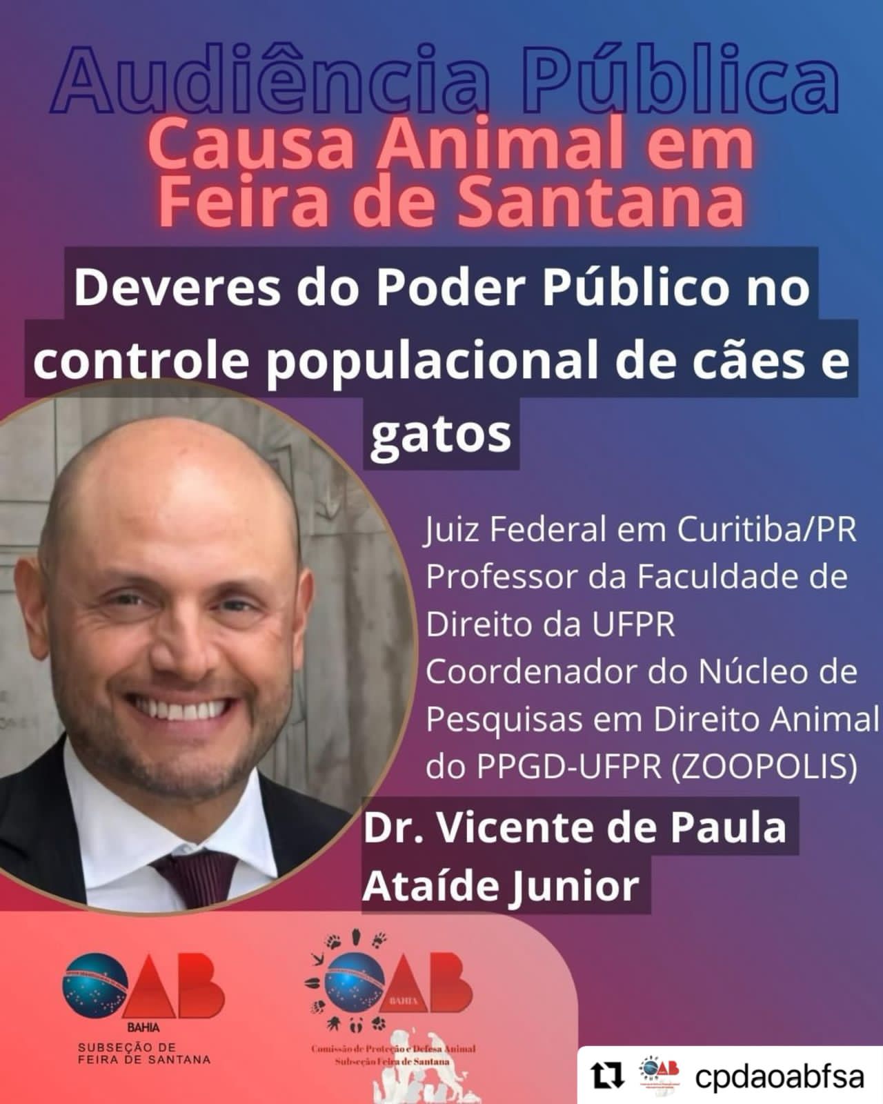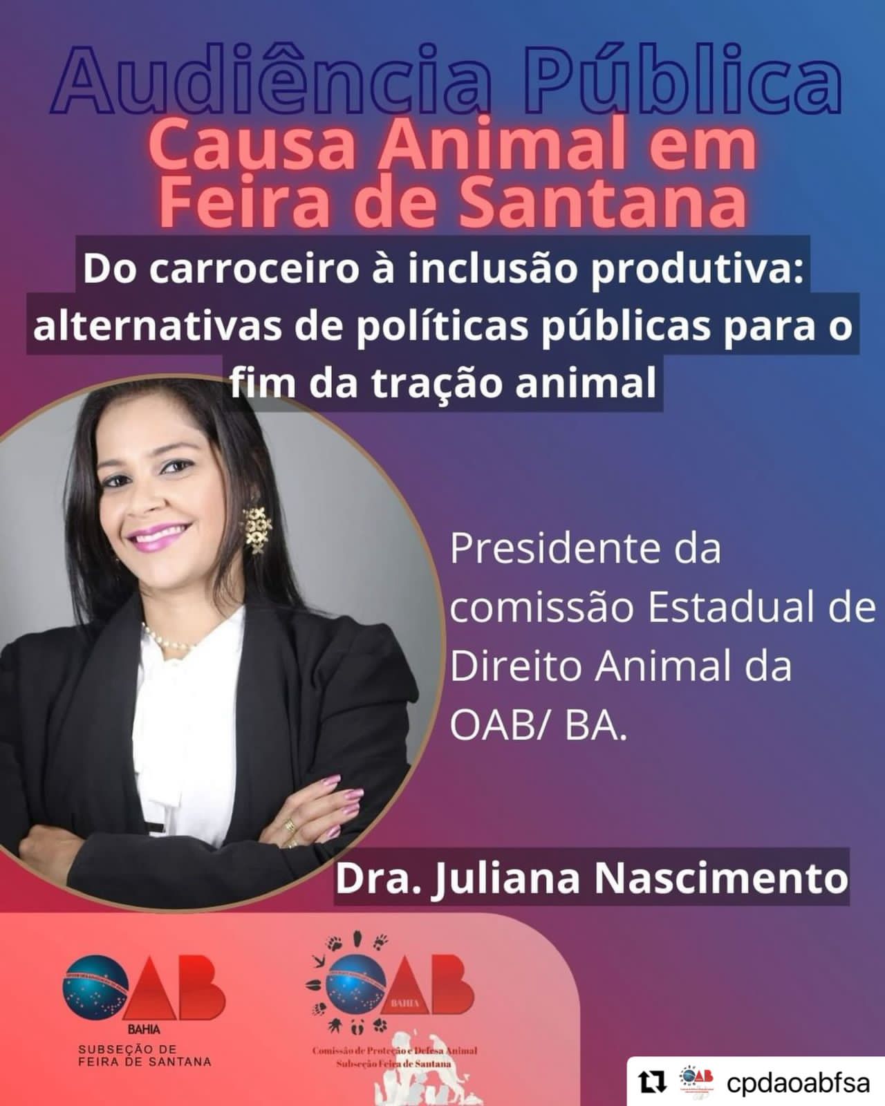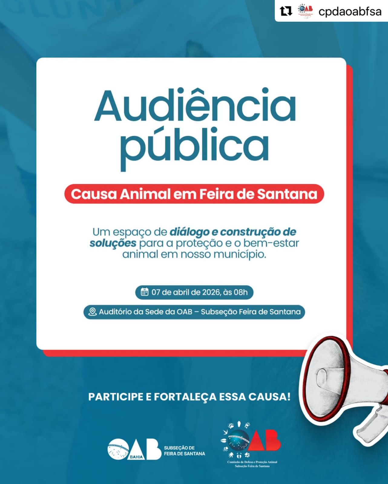 Segundo Ticiana Sampaio, presidente da Comissão de Proteção e Defesa Animal da OAB Feira, a audiência pública será uma oportunidade única para aprender, compartilhar experiências e fortalecer essa luta, considerada por ela, tão necessária. “A presença de todos é fundamental. Vamos juntos dar voz a quem não pode falar”, declara.