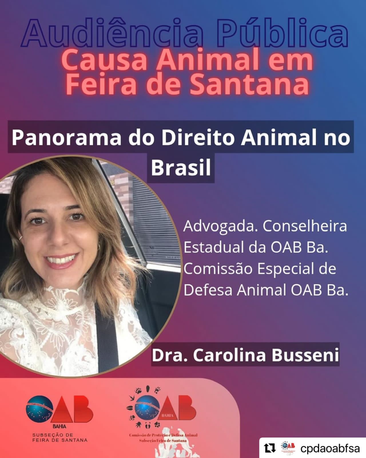 Outras palestrantes da audiência pública são: Juliana Nascimento, presidente da Comissão Estadual de Direito Animal da OAB Seccional Bahia, e Carolina Busseni, advogada, conselheira estadual da OAB Bahia e da Comissão Especial de Defesa Animal da OAB Bahia.