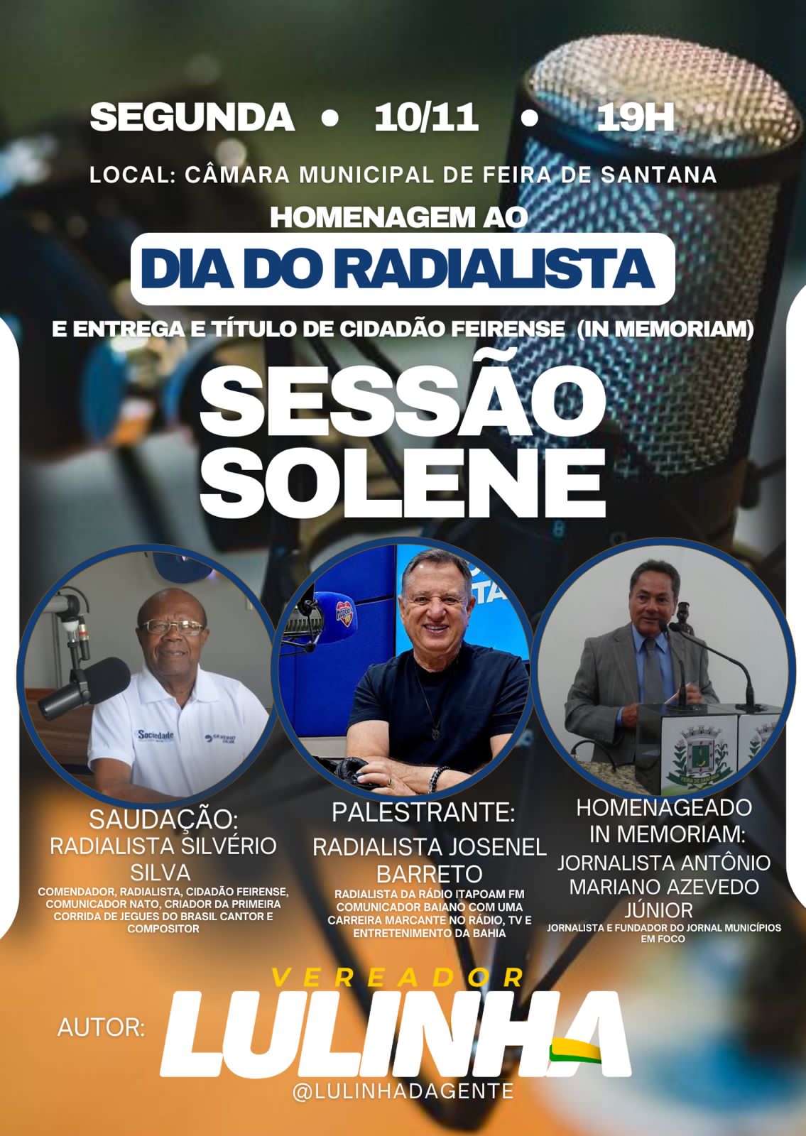 A iniciativa da homenagem partiu do vereador Luiz Augusto de Jesus, o Lulinha da Gente, que, sensível à importância do rádio na vida dos cidadãos, apresentou o requerimento que tornou possível a realização da sessão. “É com grande alegria que promovemos este momento de reconhecimento aos profissionais que dedicam suas vidas a levar informação e entretenimento aos lares de Feira de Santana”, declarou o vereador. “O rádio é um veículo de comunicação essencial, presente em todos os momentos do nosso dia a dia, e os radialistas são os responsáveis por manter essa conexão viva.”