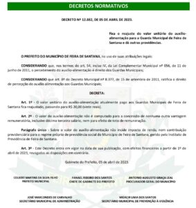 O Governo fixa o reajuste do valor unitário do auxílio-alimentação para a Guarda Municipal de Feira de Santana em R$20,00 ( Vinte reais).