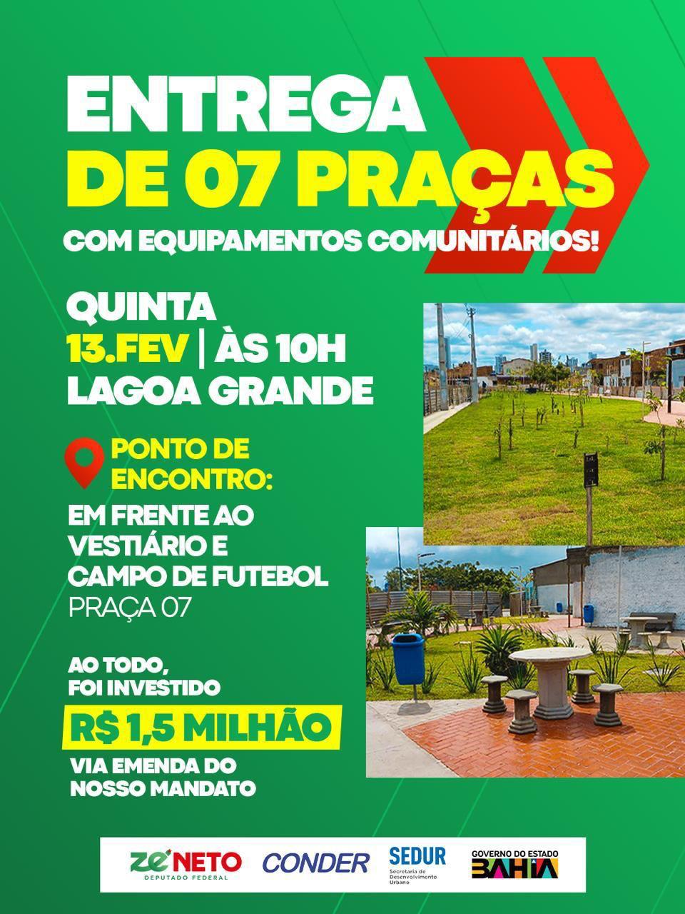 A entrega das obras acontece às 10h, em frente ao vestiário e campo de futebol, na Praça 07. O ato será conduzido pelo presidente da Companhia de Desenvolvimento Urbano da Bahia (Conder), José Trindade, e o deputado Zé Neto, com a presença de diversas autoridades e lideranças da comunidade.