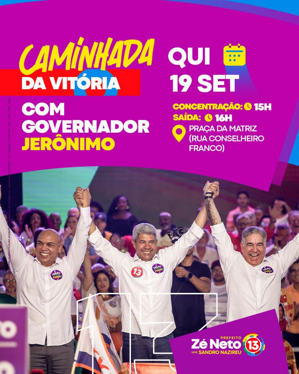 Com a presença do governador Jerônimo Rodrigues (PT), os candidatos a prefeito da coligação Pra Fazer o Futuro Acontecer, Zé Neto (PT) e a vice-prefeito Sandro Nazireu realizam, nesta quinta-feira (19), uma grande Caminhada da Vitória em Feira de Santana. A concentração está marcada para às 15h, na Praça da Matriz, no Centro.
