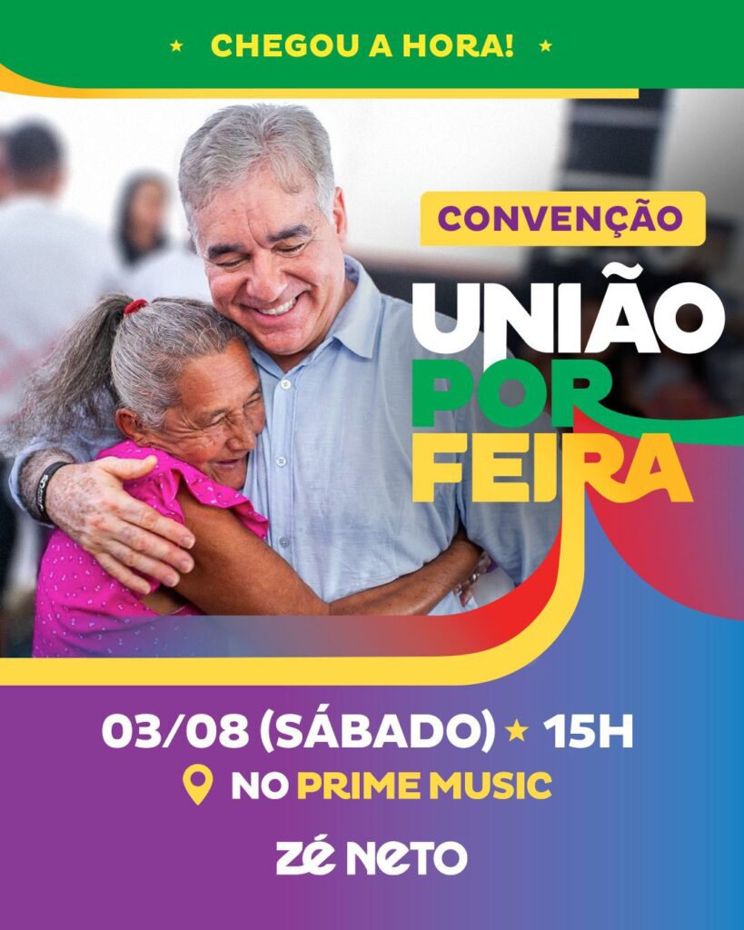 O deputado licenciado Zé Neto vai ser oficializado neste sábado (03) na Convenção da Coligação Pra fazer o futuro acontecer, como candidato a prefeito de Feira, com uma frente formada por 12 partidos, tendo ao seu lado, como vice, o líder evangélico Sandro Nazireu (Podemos). O governador Jerônimo Rodrigues e o senador Jaques Wagner, confirmaram as suas presenças.