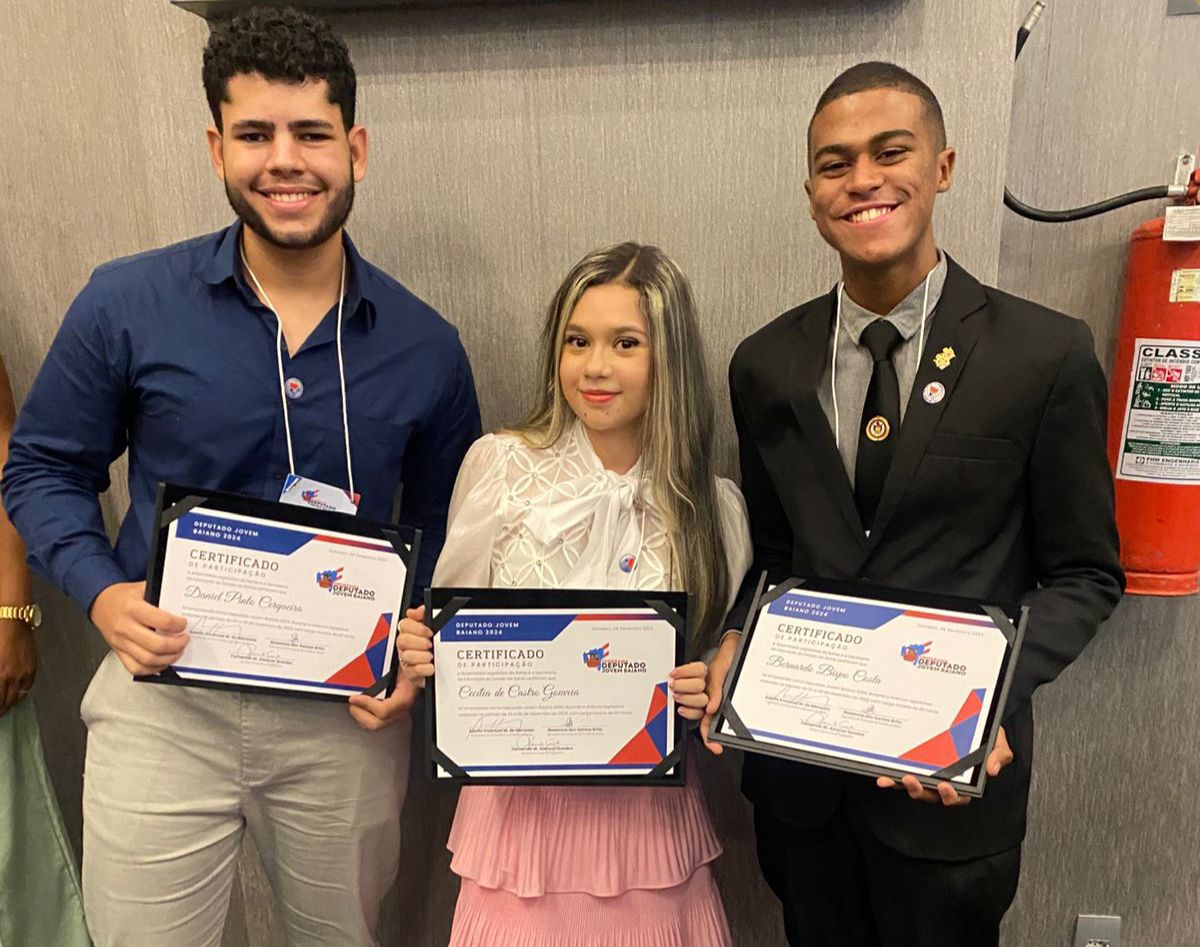 Os estudantes do Ensino Médio Cecília de Castro (Colégio Nobre), Daniel Cerqueira (Colégio Santo Antônio) e Bernardo Bispo (IFBA), estão representando Feira de Santana no Programa Jovem Deputado Baiano, que acontece entre os dias 03 e 05 de dezembro, na Assembleia Legislativa da Bahia (Alba), em Salvador. Os jovens estão entre os 63 estudantes que tiveram seus Projetos de Lei aprovados e terão a oportunidade de vivenciar a rotina de um parlamentar.