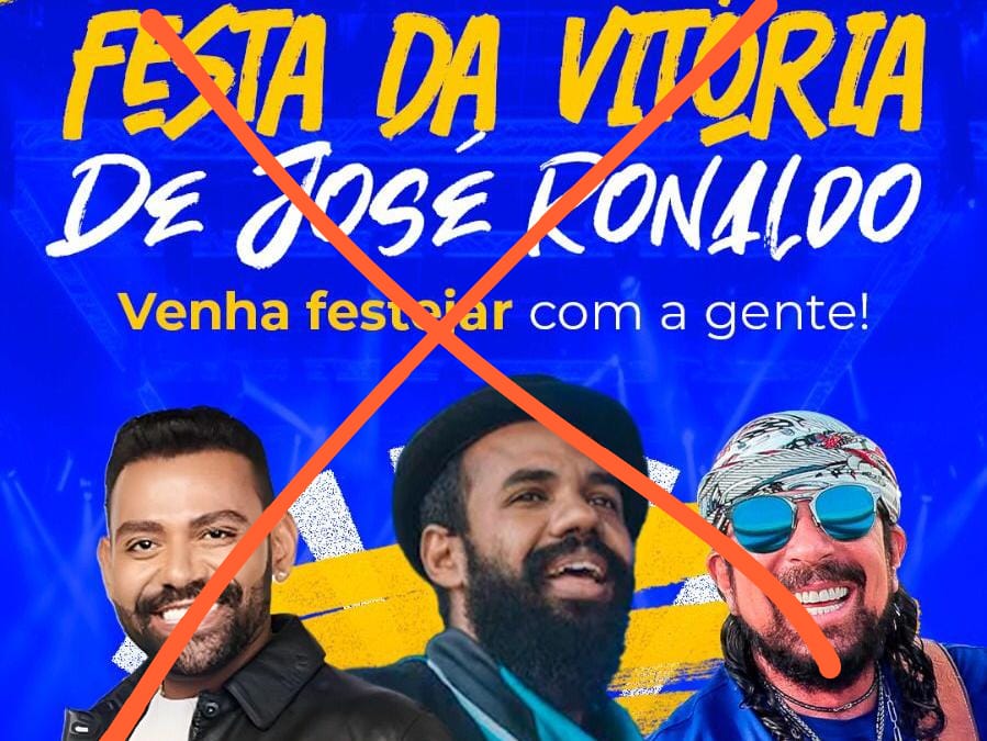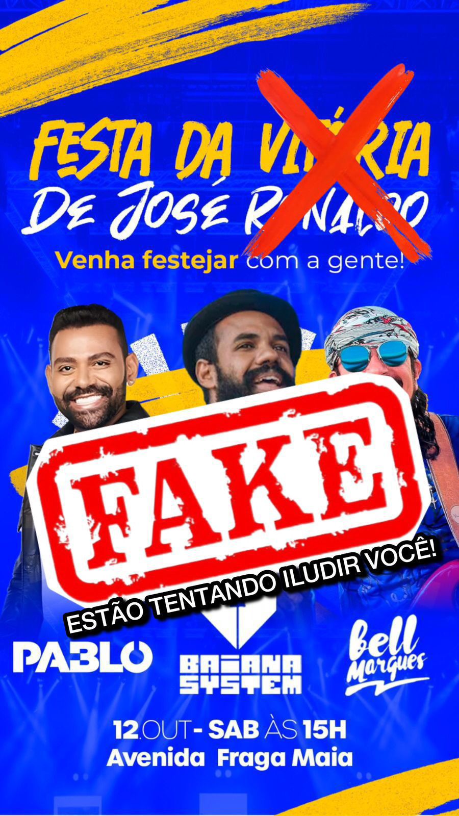Durante a manhã desta quinta-feira (03) circulou nas redes sociais divulgação falsa de show com os artistas Pablo; Bell Marques e Baiana System em suposta comemoração no caso da eventual vitória do candidato Zé Ronaldo. A notícia pode ser facilmente desmentida no perfil oficial dos artistas onde se constata que os mesmos estão em outros compromissos no dia do suposto show em Feira.