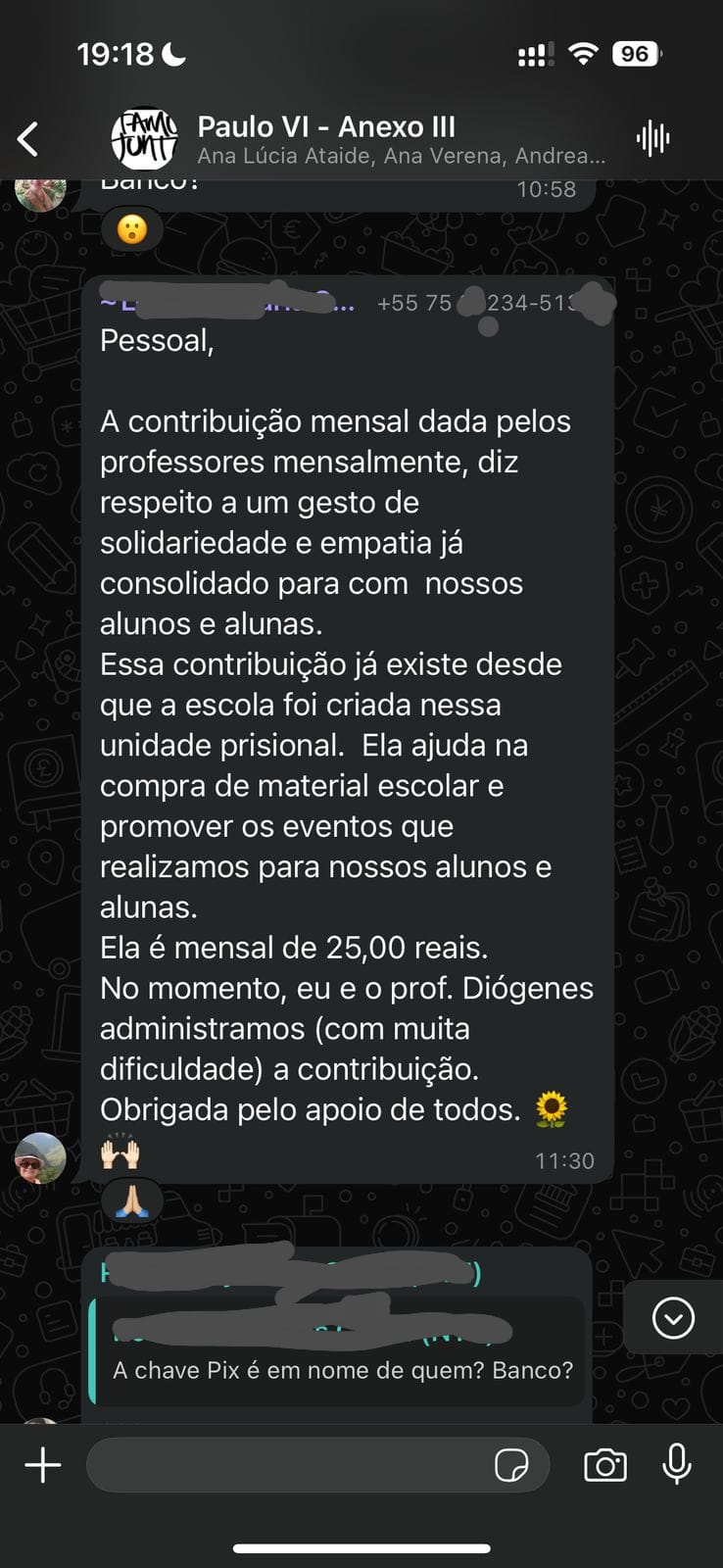 “A contribuição mensal dada pelos professores diz respeito a um gesto de solidariedade e empatia já consolidado para com nossos alunos e alunas. Essa contribuição já existe desde que a escola foi criada nessa unidade prisional. Ela ajuda na compra de material escolar e a promover os eventos que realizamos para nossos alunos e alunas. Ela é mensal de 25,00 reais. No momento, eu e o professor D administramos (com muita dificuldade) a contribuição. Obrigada pelo apoio de 25,00 reais.”