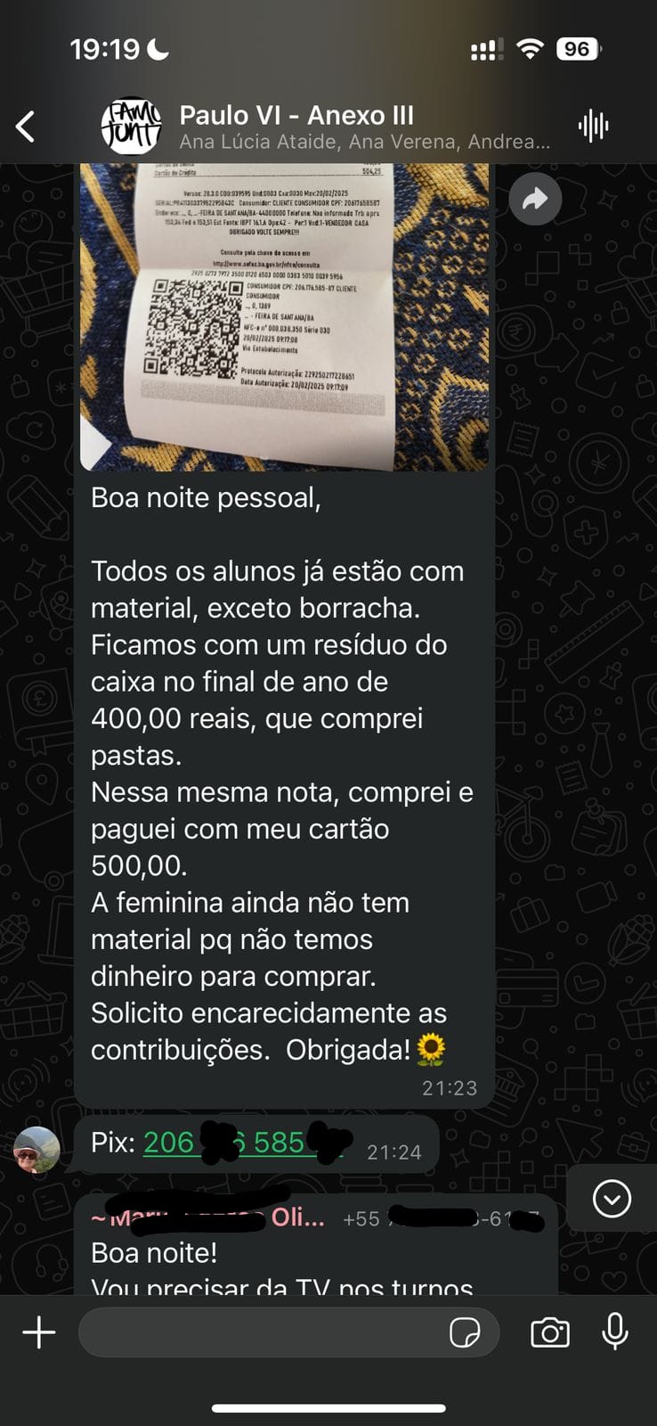 “Boa noite, pessoal! Todos os alunos já estão com material, exceto borracha. Ficamos com um resíduo da caixa no final do ano de 400,00 reais, que comprei pastas. Nessa mesma nota, comprei e paguei com meu cartão 500,00. A feminina ainda está sem material porque não temos dinheiro para comprar. Solicito encarecidamente as contribuições. Obrigada!”