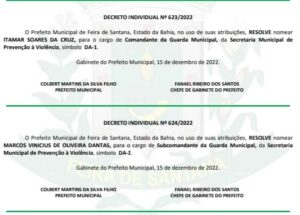 O prefeito de Feira de Santana Colbert Martins MDB, nomeou nesta sexta-feira (16), o novo comandante e sub-comandante da Guarda Municipal. Ele exonerou o sub-comandante Itamar Suares da Cruz e o nomeou para comandante.
