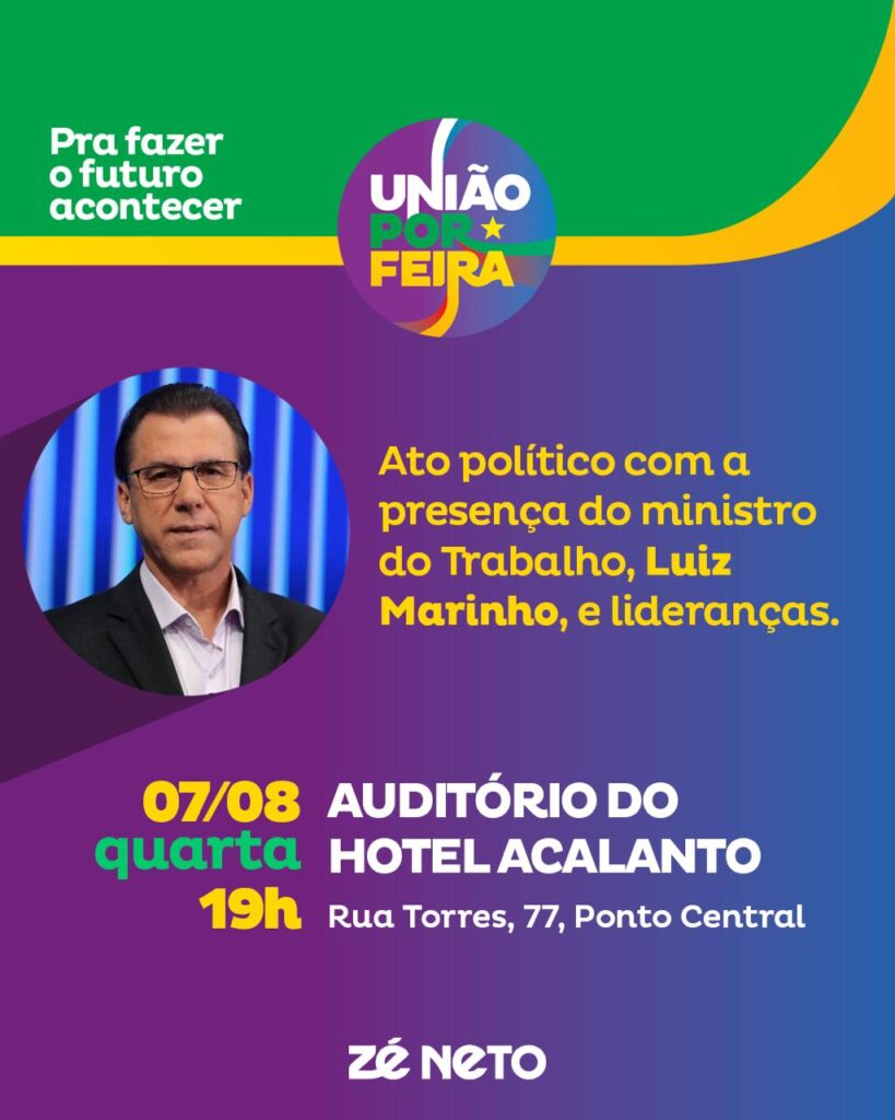 Feira de Santana se prepara para receber um importante evento político nesta quarta-feira, 8 de agosto. O Auditório do Hotel Acalanto será o palco do Ato Político com a presença do Ministro do Trabalho, Luiz Marinho. O evento está agendado para às 19h e promete reunir diversas lideranças locais para um diálogo sobre o futuro do município.
