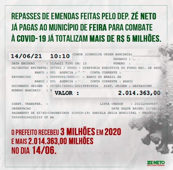 Zé Neto cobrou ainda transparência da prefeitura sobre a aplicação desses recursos e disse “esperar que o município assuma o compromisso de construir esses importantes equipamentos, fazendo frente à pandemia que já vitimou mais de 800 feirenses – foram 100 mortes em maio e 61 na primeira quinzena de junho, segundo dados da Sesab”.