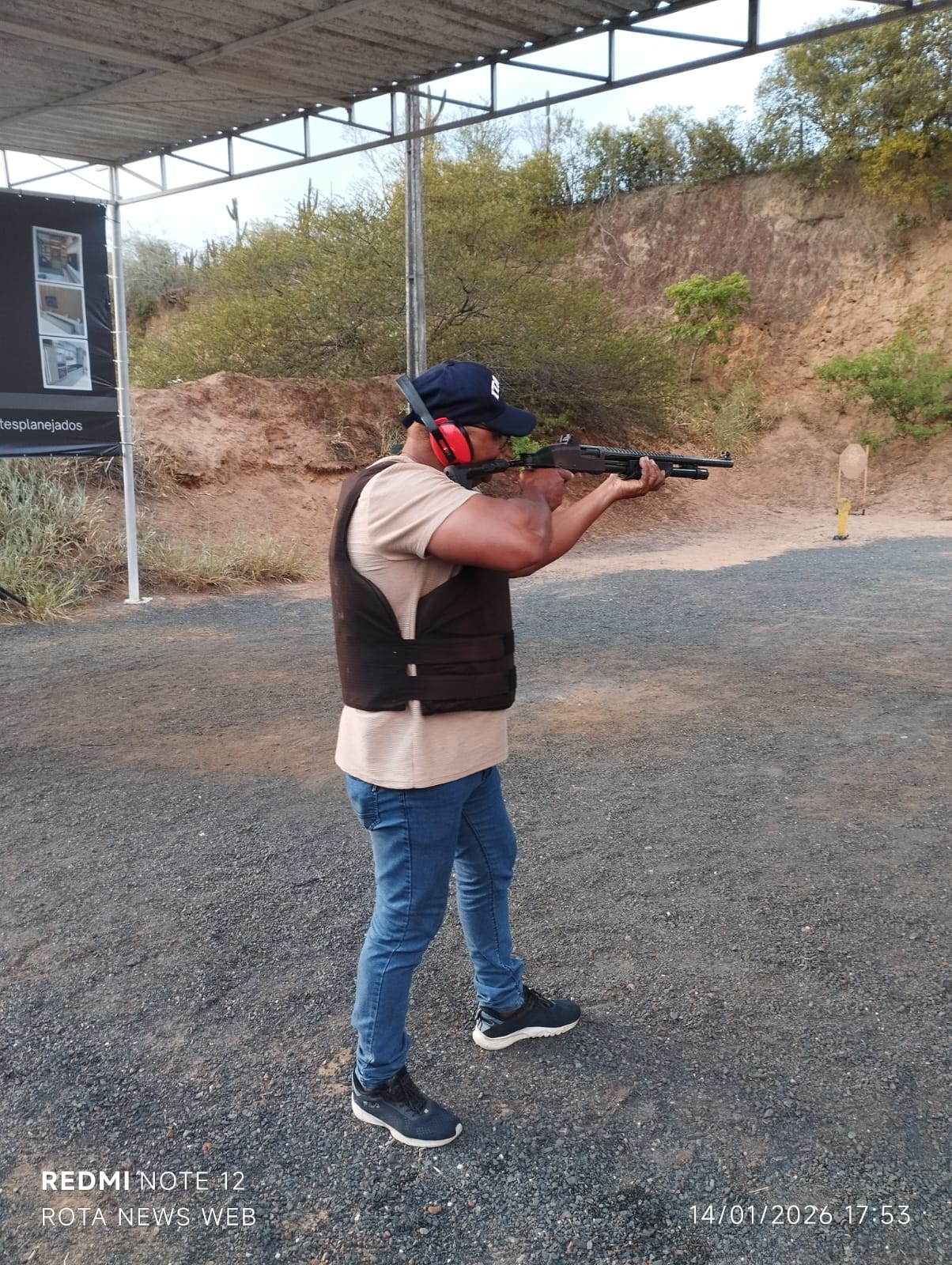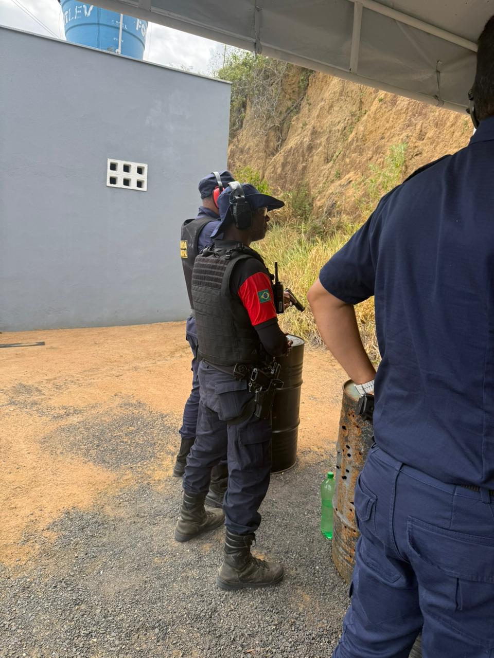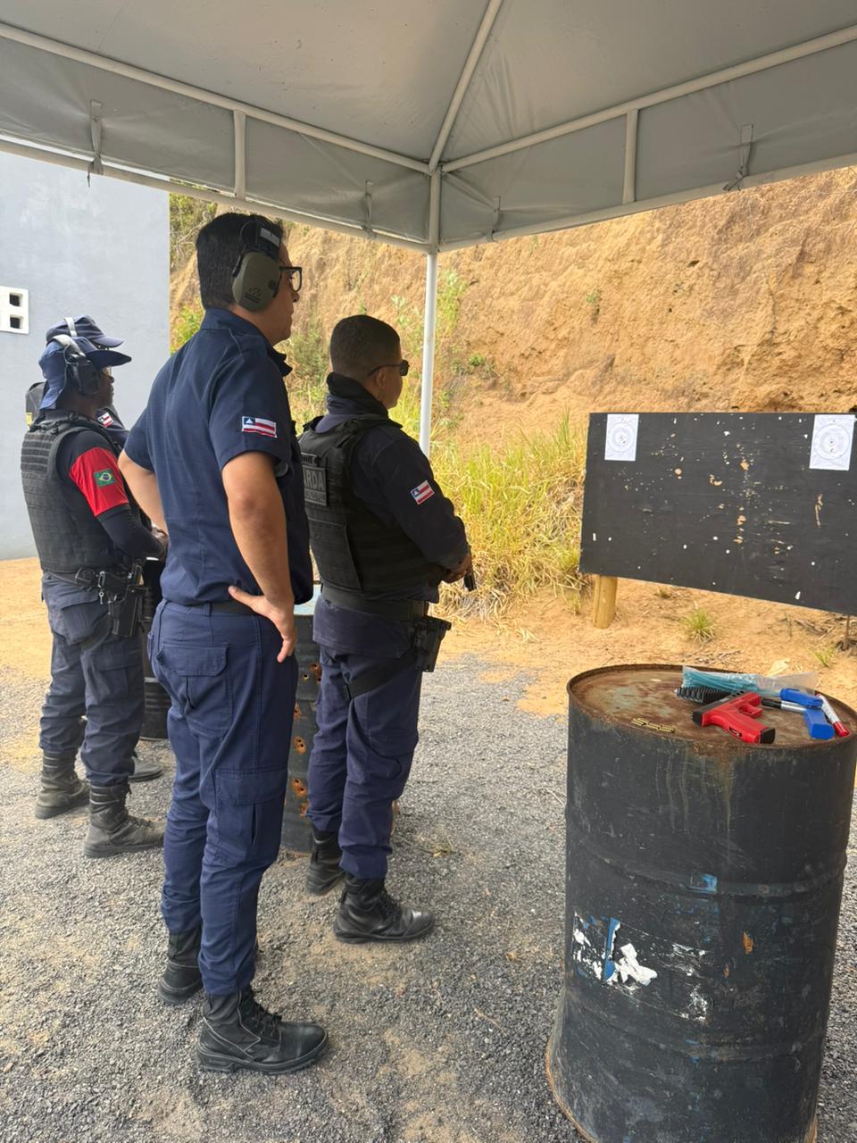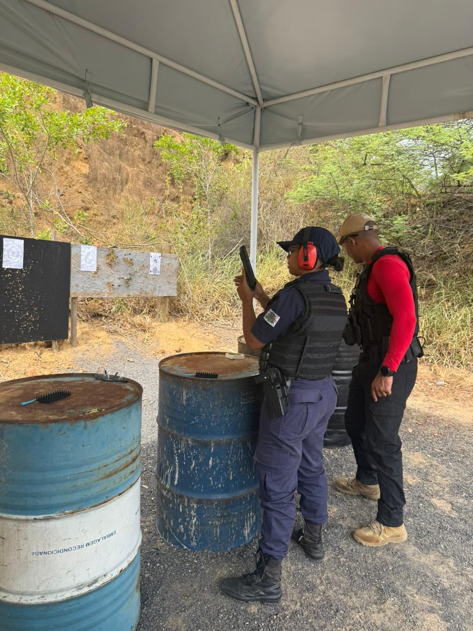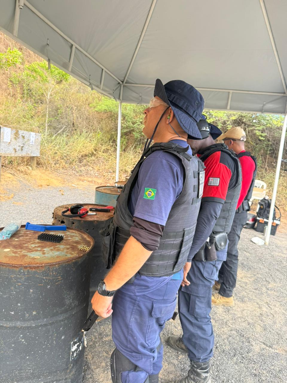 Treinamento de tiro com revólver 38, pistola 380, pistola .40 (ponto quarenta) e espingarda calibre 12; no total, foram disparados 50 tiros – 15 de pistola 380, 20 de pistola .40, 10 de revólver 38 e 5 de calibre 12.